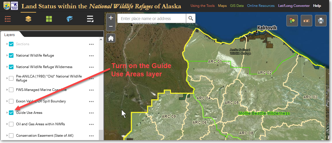 The primary source for obtaining Guide Use Area maps is via the USFWS Region 7 Land Mapper. Follow the steps below to select and download maps.