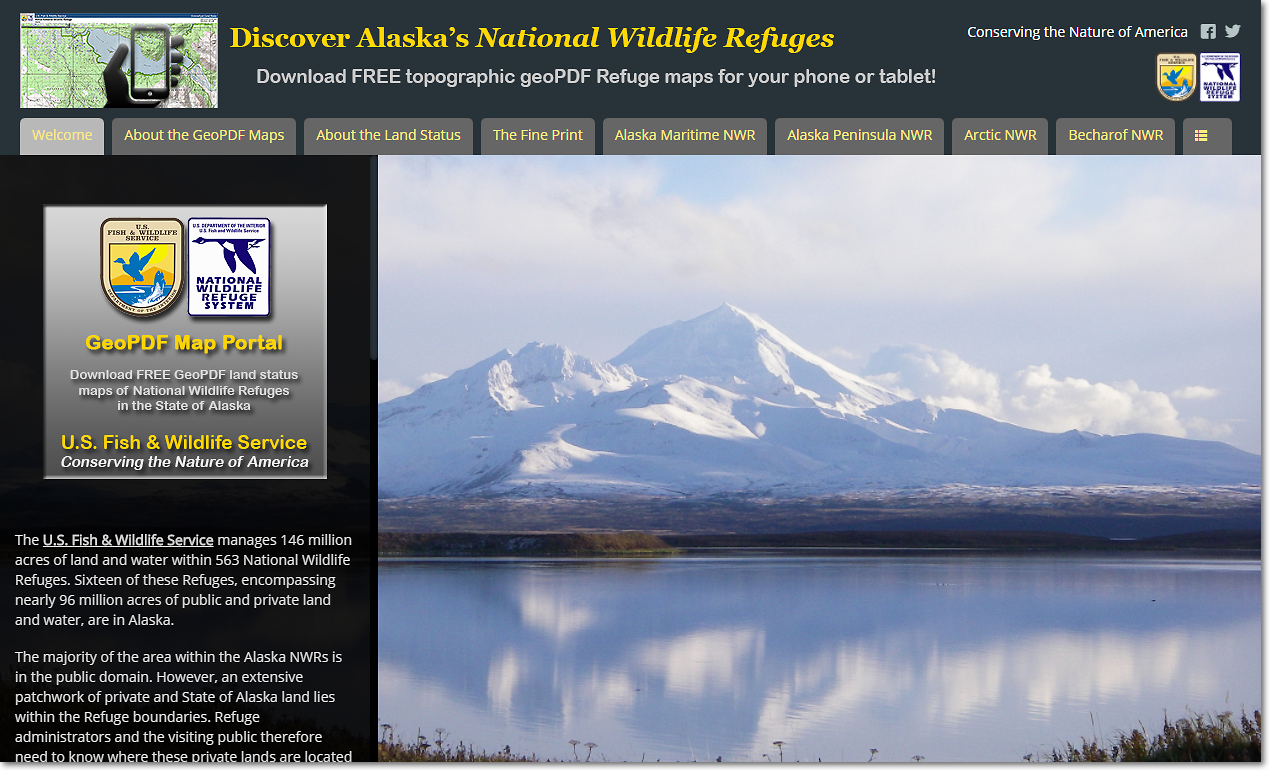 The USFWS Region 7 GeoPDF Map Portal is the primary source for free, downloadable geoPDF land status maps for the National Wildlife Refuges* within the State of Alaska. Maps are available at two scales: 1:30,000 and 1:250,000. The 1:250,000 scale maps are updated quarterly on January 1, April 1, July 1, and October 1. The 1:30,000 scale maps are updated annually, during the first half of January.