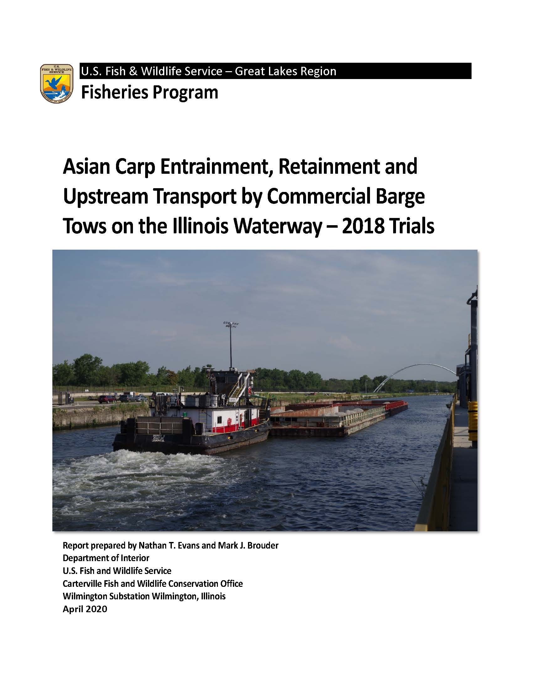 In 2018, the U.S. Fish and Wildlife Service conducted an experimental study to assess the potential for juvenile Asian carp to be both entrained and retained within barge junction gaps and transported upstream and into a navigation lock chamber in the Illinois Waterway. The results of the research illustrate that there is a potential for small Asian carp to be inadvertently trapped and transported by commercial barge tows through upstream lock chambers. The 2018 field trials were completed using three species of live small Asian carp including silver carp, bighead carp and grass carp. Work was completed in the La Grange and Peoria pools of the Illinois Waterway in Illinois where self-sustaining populations of Asian carp are already established.