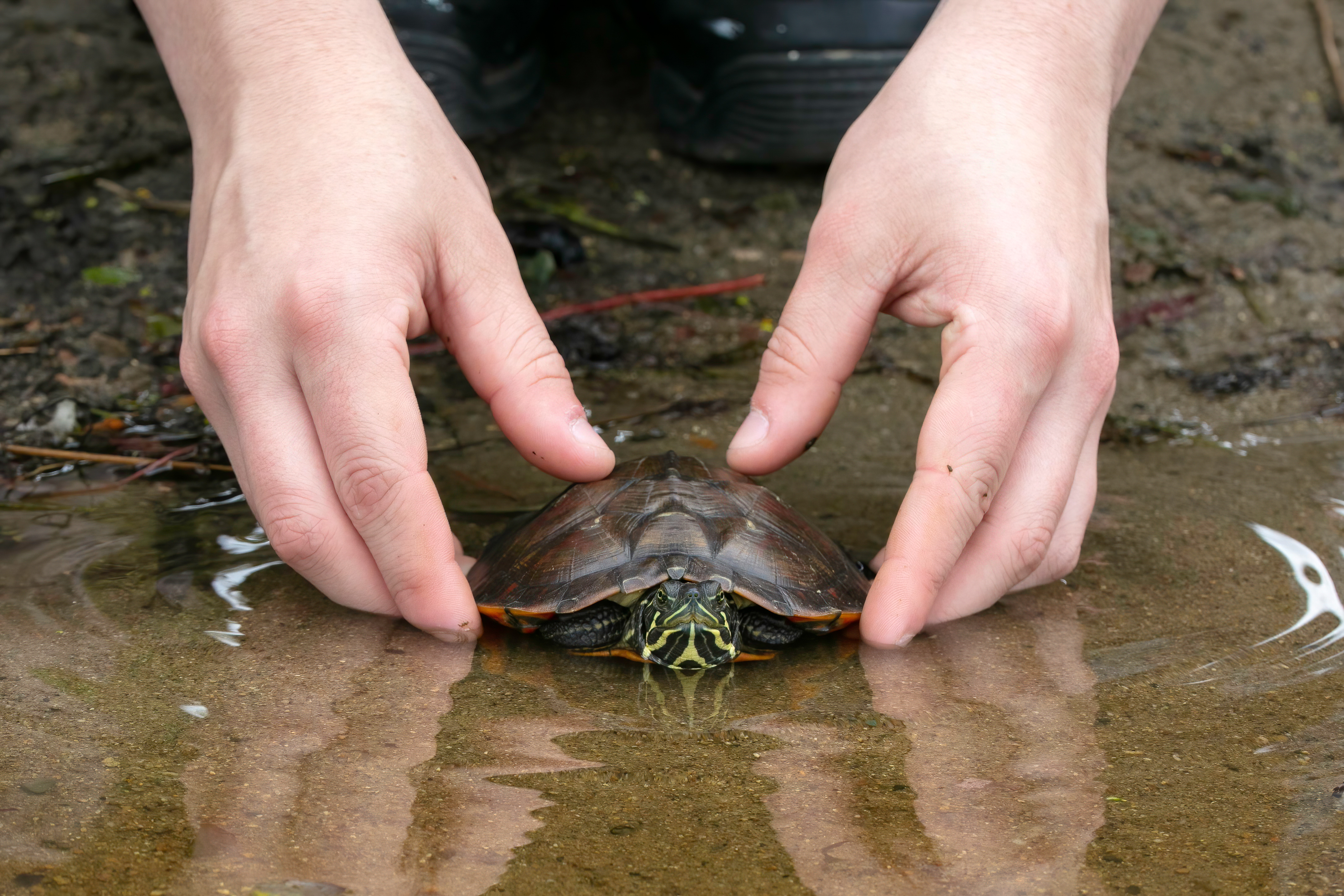 A northern red-bellied cooter graduates from MassWildlife's Headstart Program, and returns to the pond where it came from.