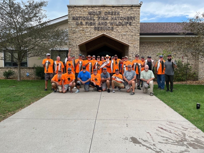 Participants of the 2023 Wounded Warrior Fishing Derby at Wolf Creek National Fish Hatchery holding their catch after fishing for stripers on Lake Cumberland.