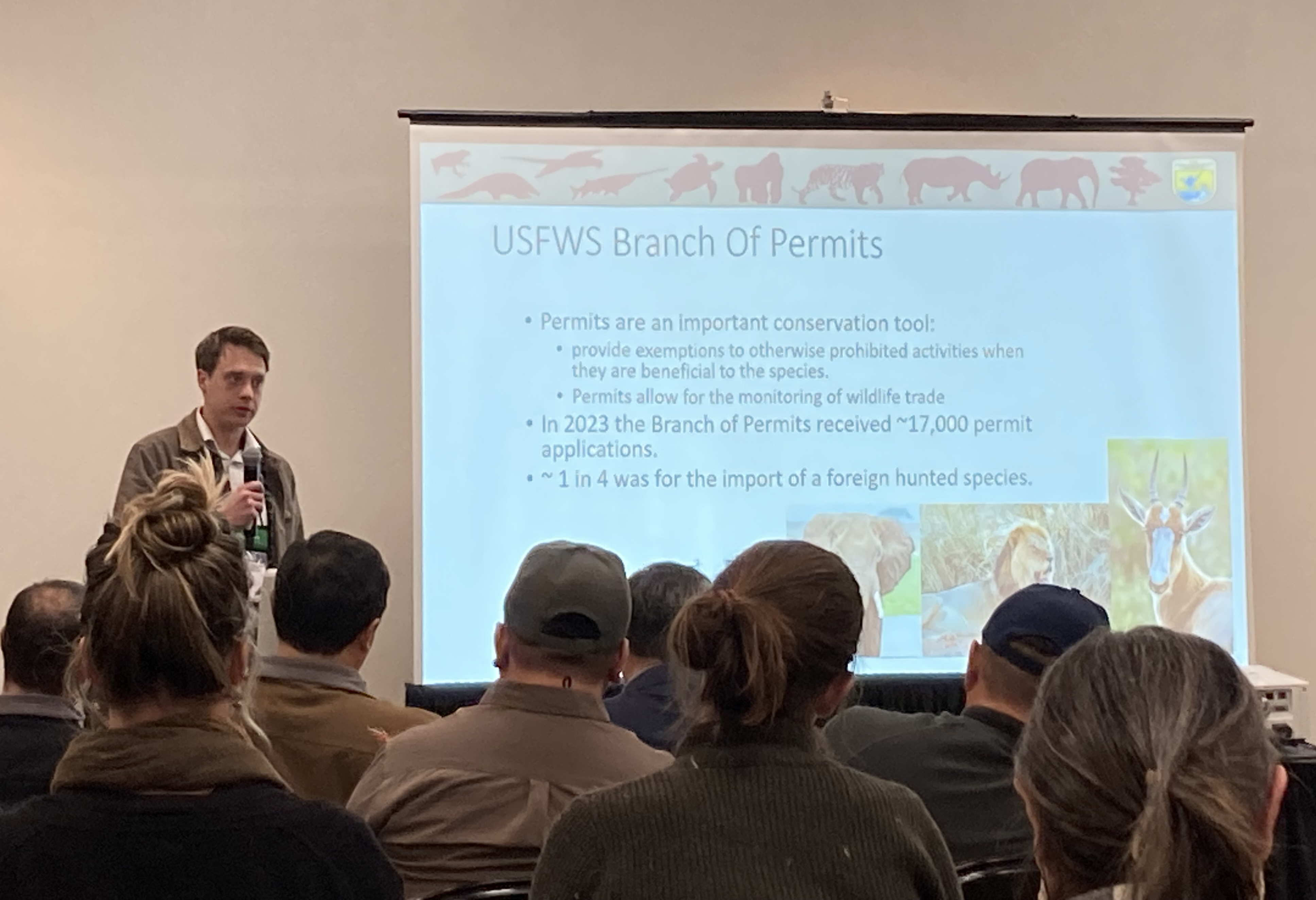 Supervisory Biologist Jacob Messler speaks about the Service's permitting program at the 2024 Wild Sheep Show. The title of his presentation was, "Permitting the Importation of Trophies into the United States." (Please note: on the slide it reads, "We received ~17,000 permits." It should read, "We received ~3500 actual applications, from which we finalized 17,000 permits.")