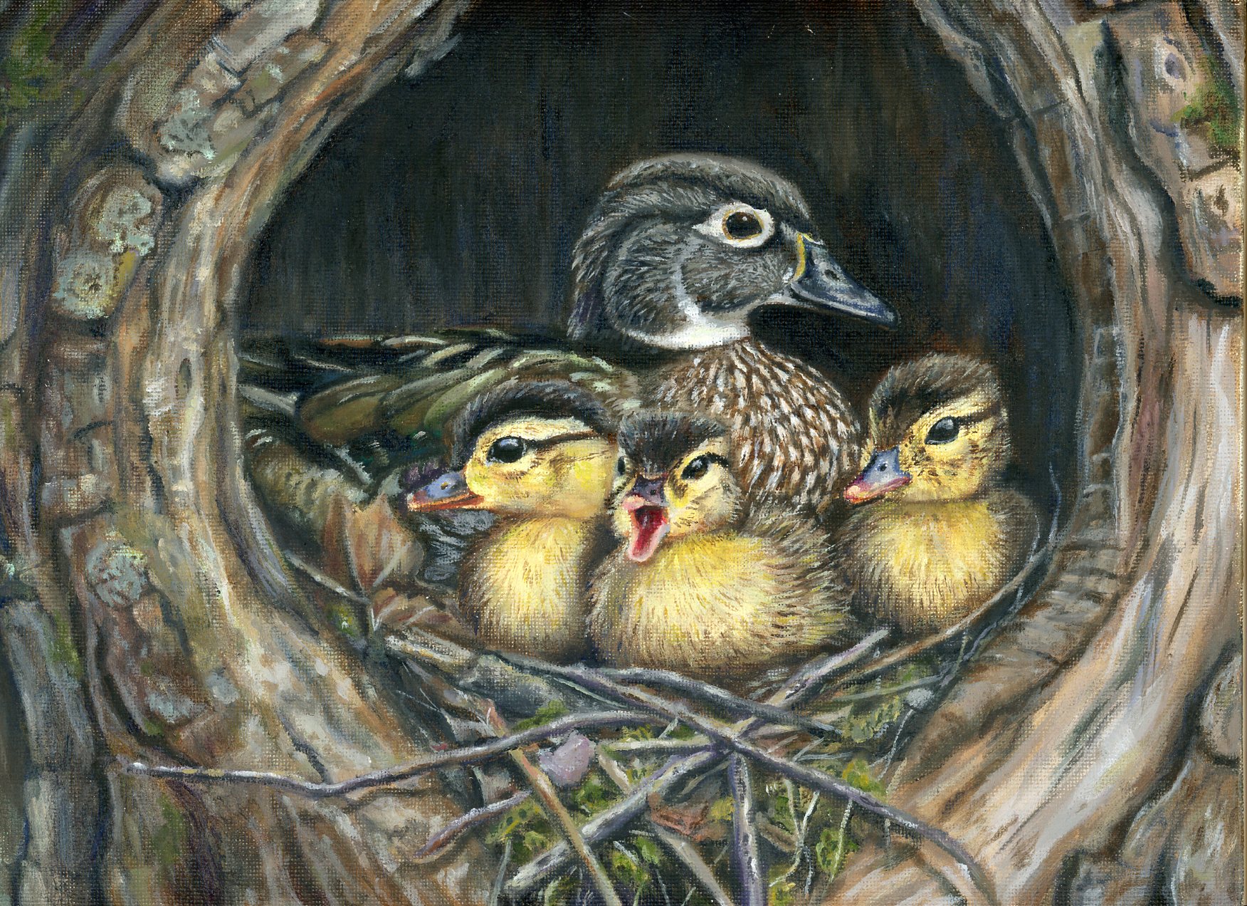 The Best-of-Show winner for Maryland for the 2026 Junior Duck Stamp design contest. An oil painting of a female wood duck with three ducklings by 16-year-old Ryan Huan of Sykesville, Maryland. Instructed by May-Fong Tsay of May's Studio.