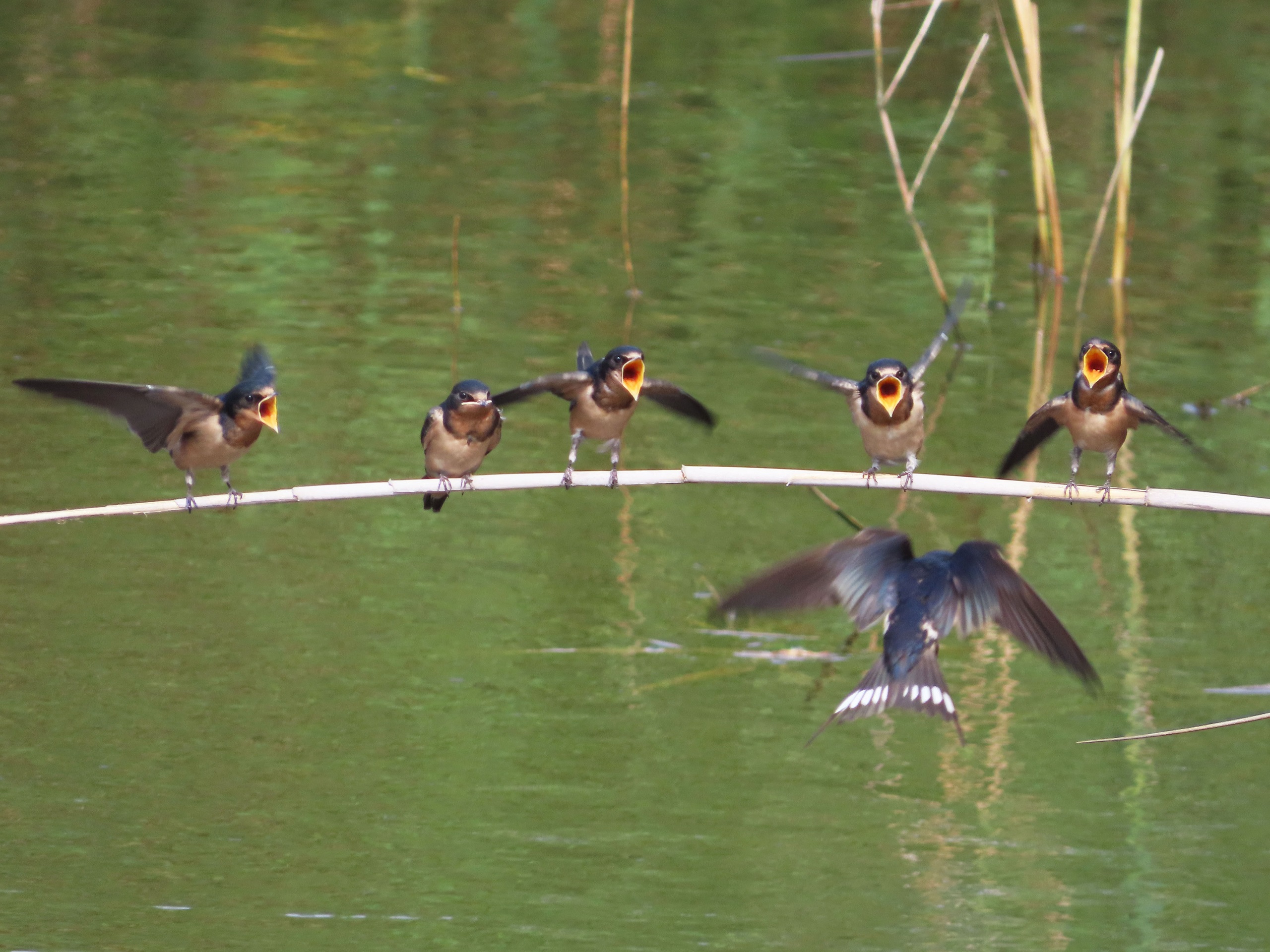 5 young fledgling barn swallows lined up left to right standing on a branch hanging over green water as adult swallows swoop with food