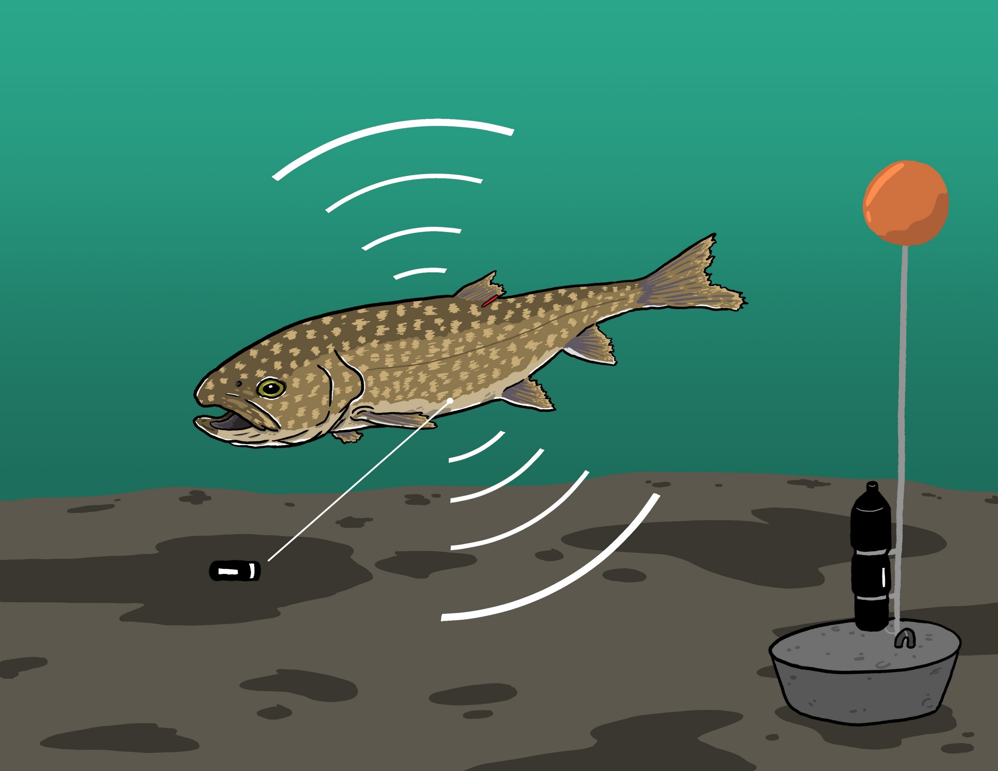 Illustration of a tagged lake trout “pinging” an acoustic receiver sitting on the bottom of a lake.