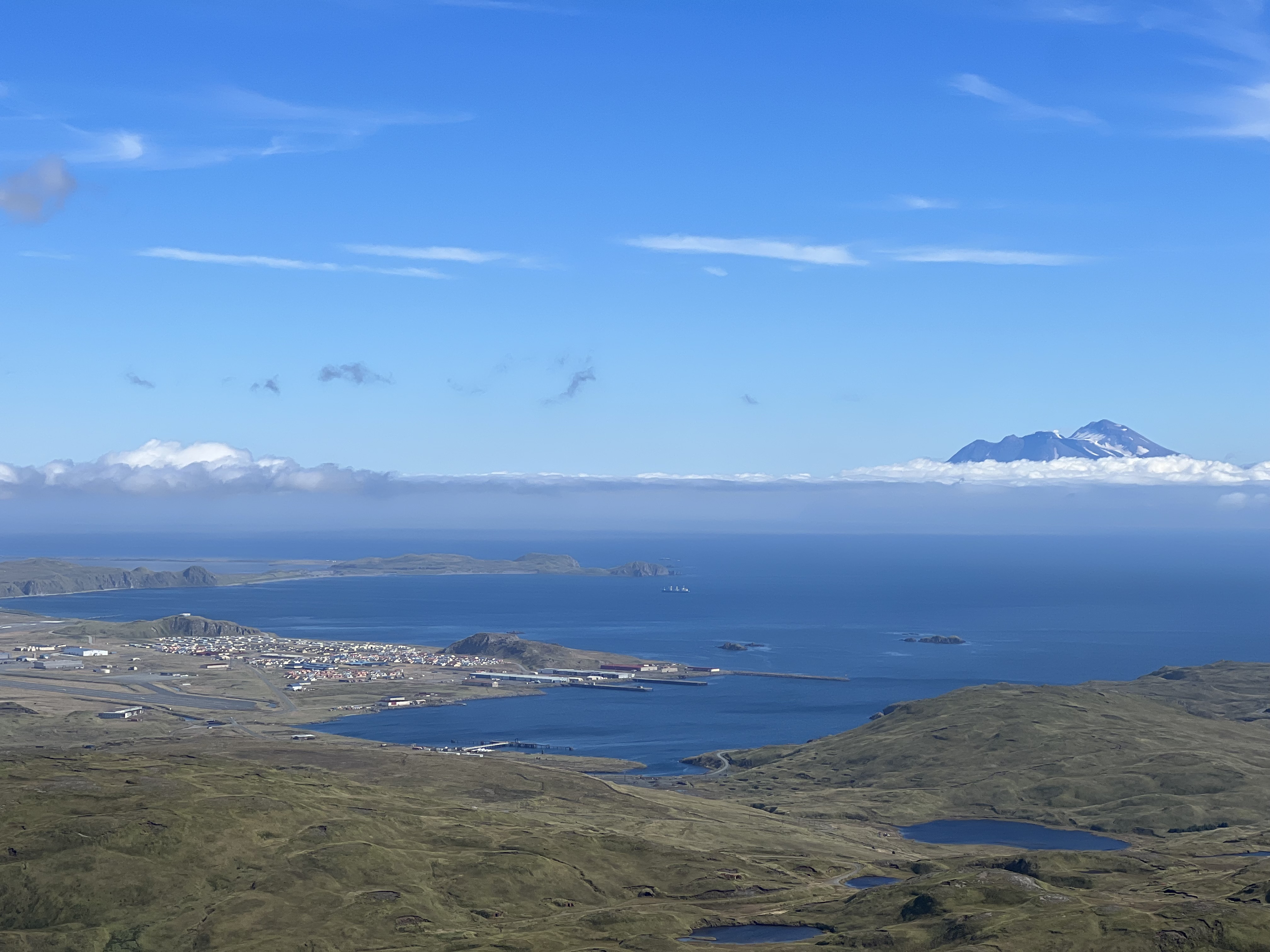 The town of Adak with the island Great Sitkin in the background.
