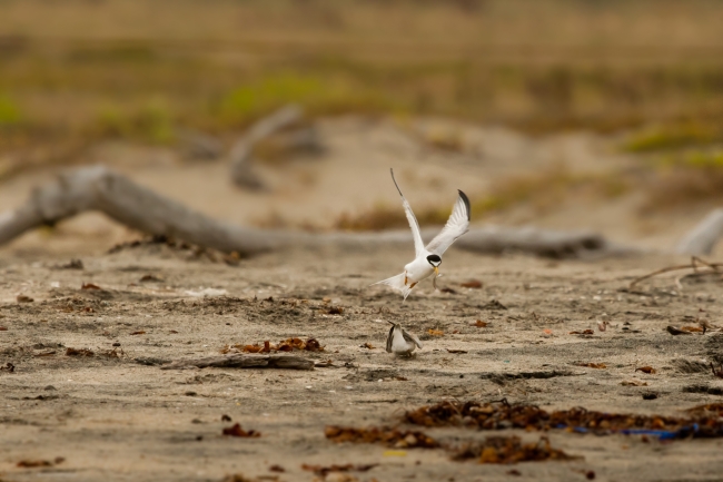 An adult California least tern brings a fish to it's begging chick, who a few weeks old.