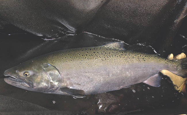 An adult winter Chinook salmon that returned to the Coleman National Fish Hatchery as part of the Jumpstart Program on Battle Creek.