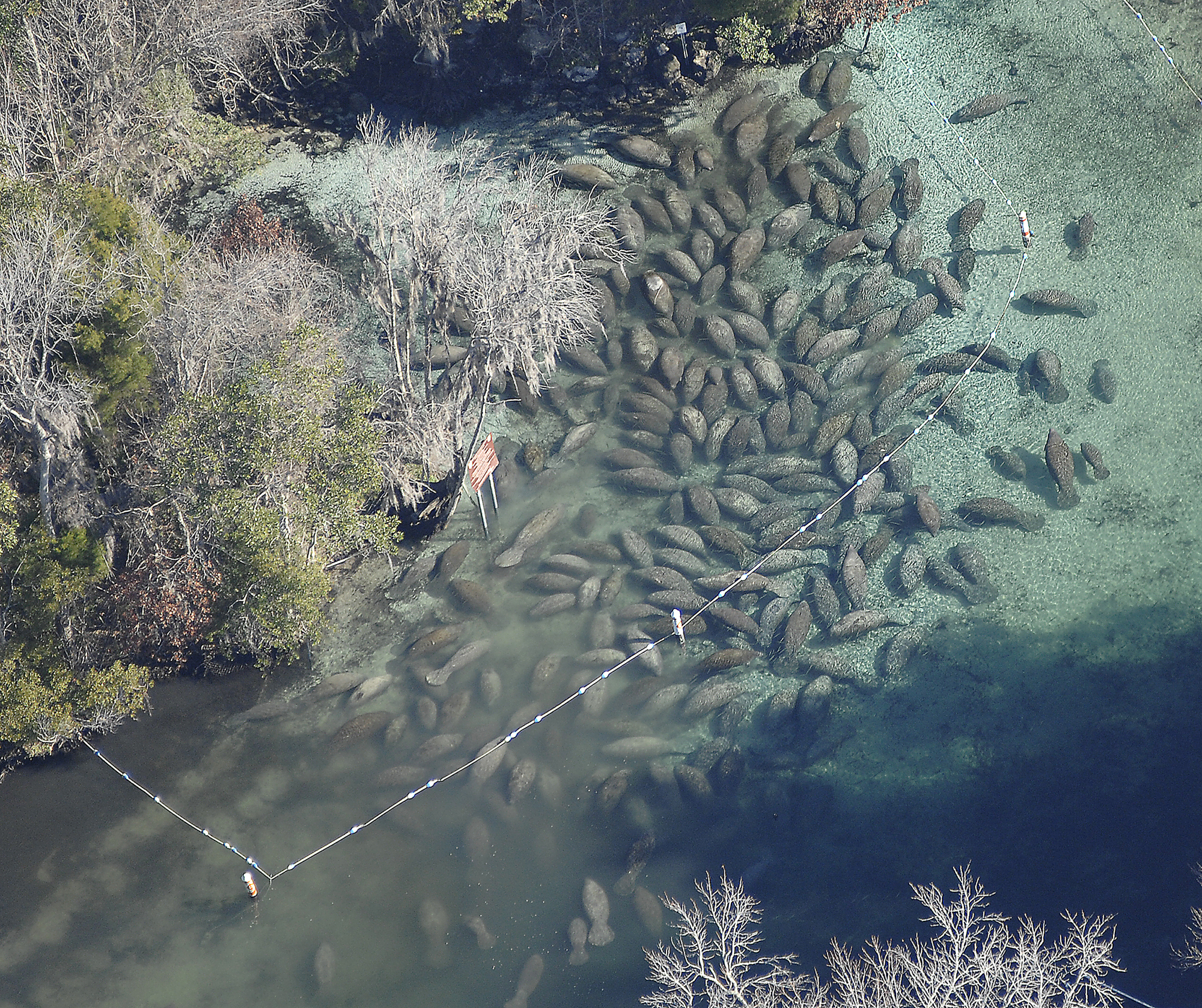Manatees gather for warmth in the 72-74 degree F warm water springs during a cold winter day