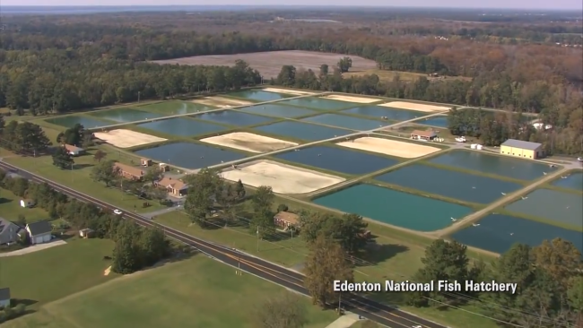 This is an aerial view of Edenton National Fish Hatchery. The tan rectangles are empty ponds. The ponds with water are various shades of blue and green, depending on algal growth and other water quality factors.
