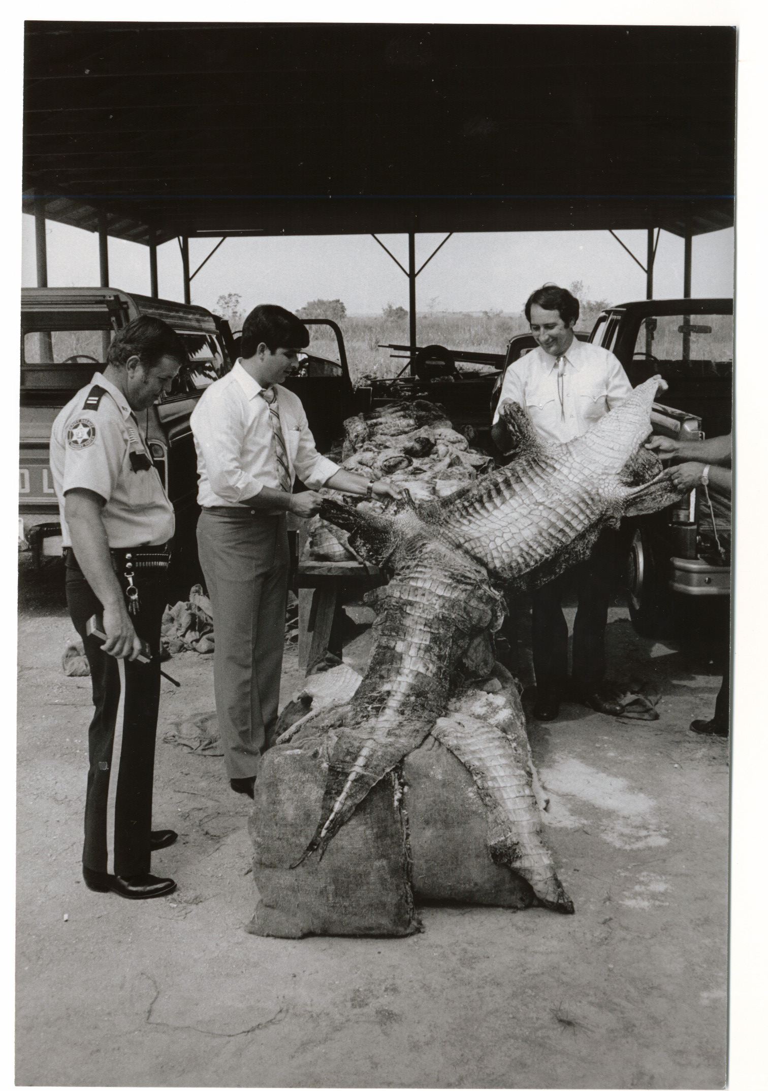 In early days of CITES implementation, a Law Enforcement Officer looks on as two Service representatives examine a crocodile skin.