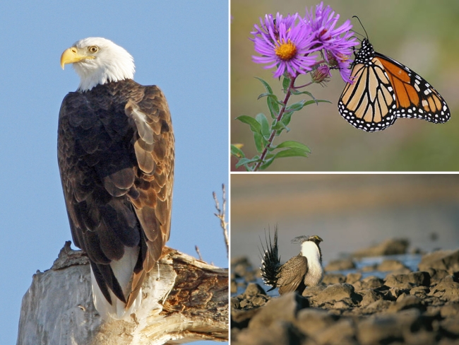 Bald eagle, monarch butterfly, and greater sage grouse.