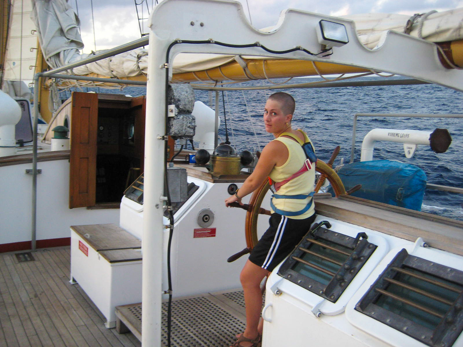 Alison Deary steering the SSV Robert C. Seamans somewhere south of the equator heading towards Tahiti, spring 2008. Sailing across the equator, she and many of her classmates shaved their heads as an offering to Neptune for continued safe passage on the journey