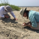 Mike Kunz (left), a conservation ecologist at North Carolina Botanical Garden, and April Punsalan, a Service botanist, plant seabeach amaranth seeds on Cape Romain National Wildlife Refuge.