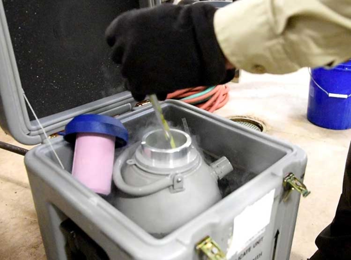 Williams Creek National Fish Hatchery Biologist Russell Wood removes Apache trout milt (fish semen) from sub-zero storage. This milt was collected from the wild to introduce new genetics into the Williams Creek Apache trout stock.