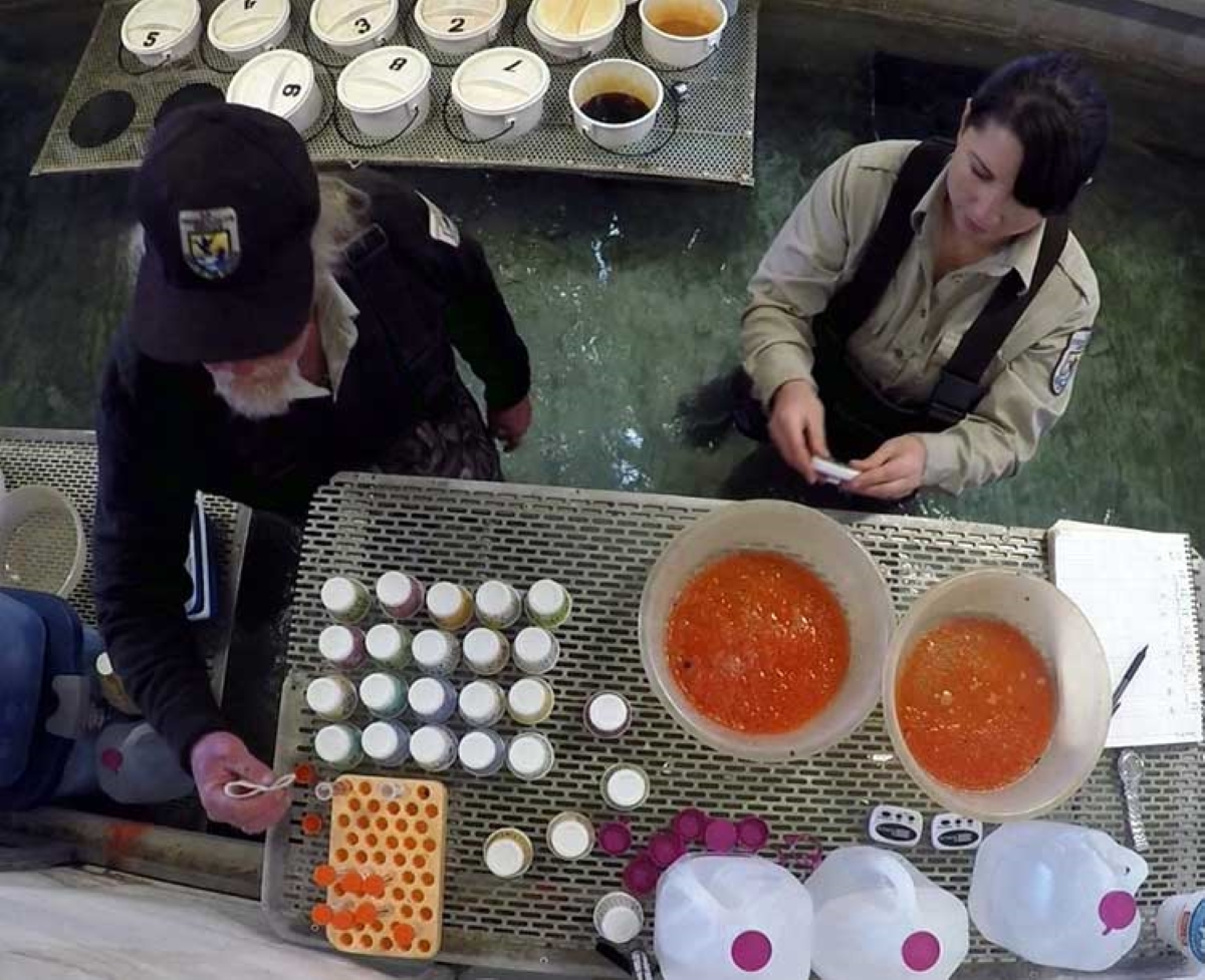 Williams Creek National Fish Hatchery Biologist Russell Wood (left) stores collected ovarian fluid to test the Apache trout stock for disease. Arizona Fish and Wildlife Conservation Office Biologist Stephanie Vail-Muse (right) sets a timer for eggs mixed with milt (fish semen).
