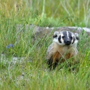A badger peers out from the lush green grass and blue wildflowers at Red Rock Lakes National Wildlife Refuge. Photo by James "Newt" Perdue/USFWS Volunteer.