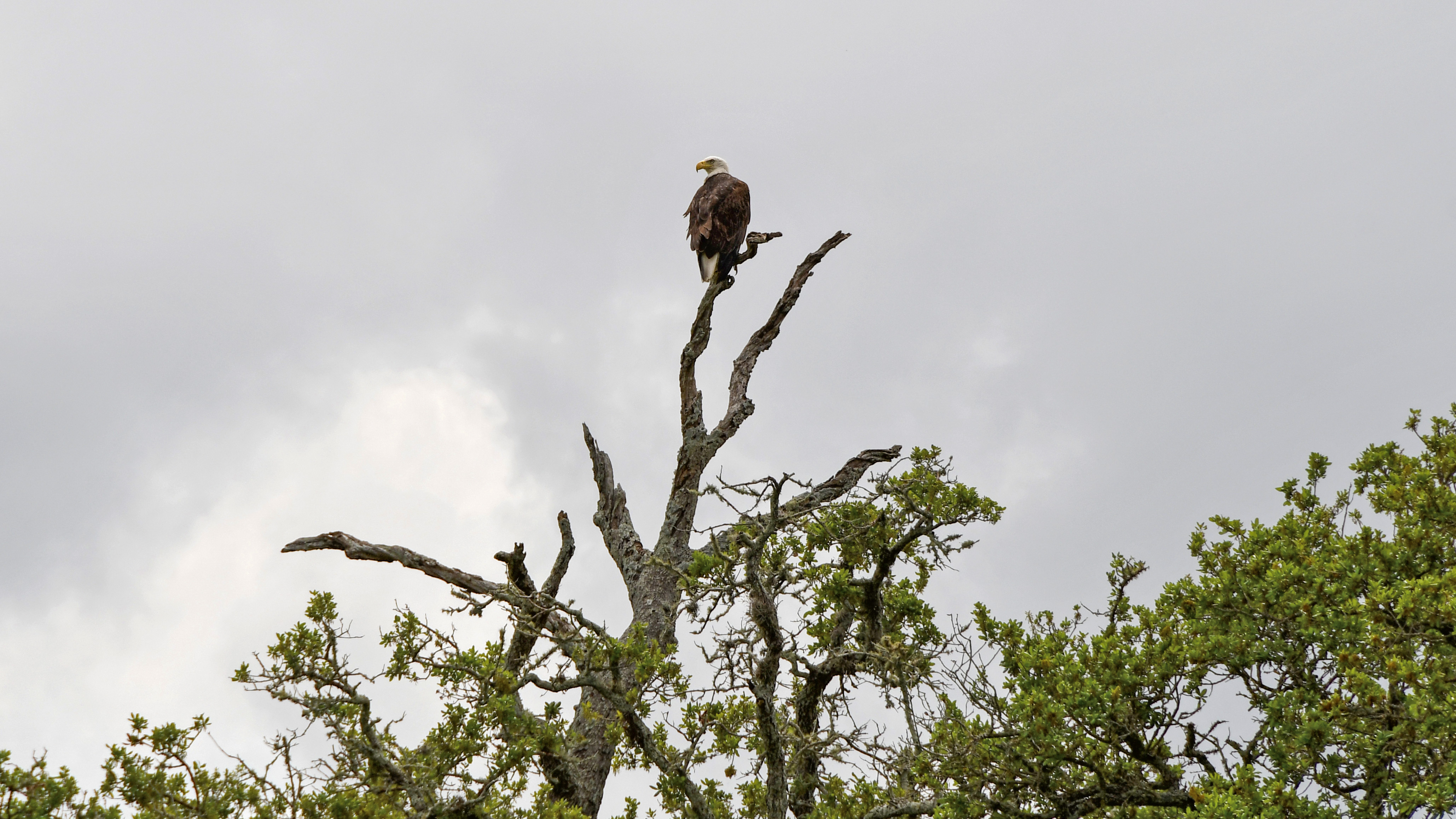 A bald eagle sits on top of an oak tree at a ranch in Jackson County, Texas.