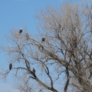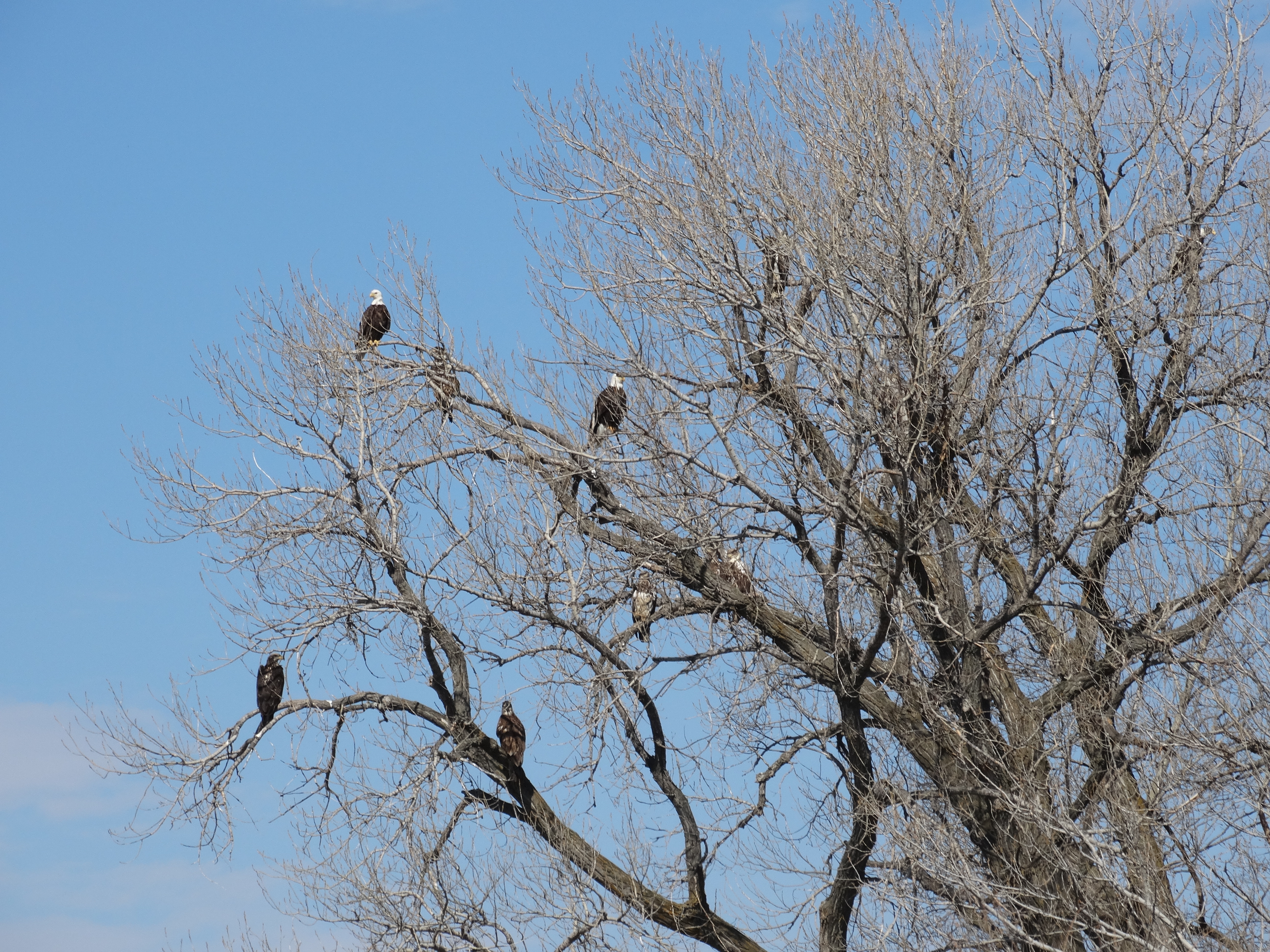 Multiple bald eagles are perched in a tree on the Karl E. Mundt NWR.