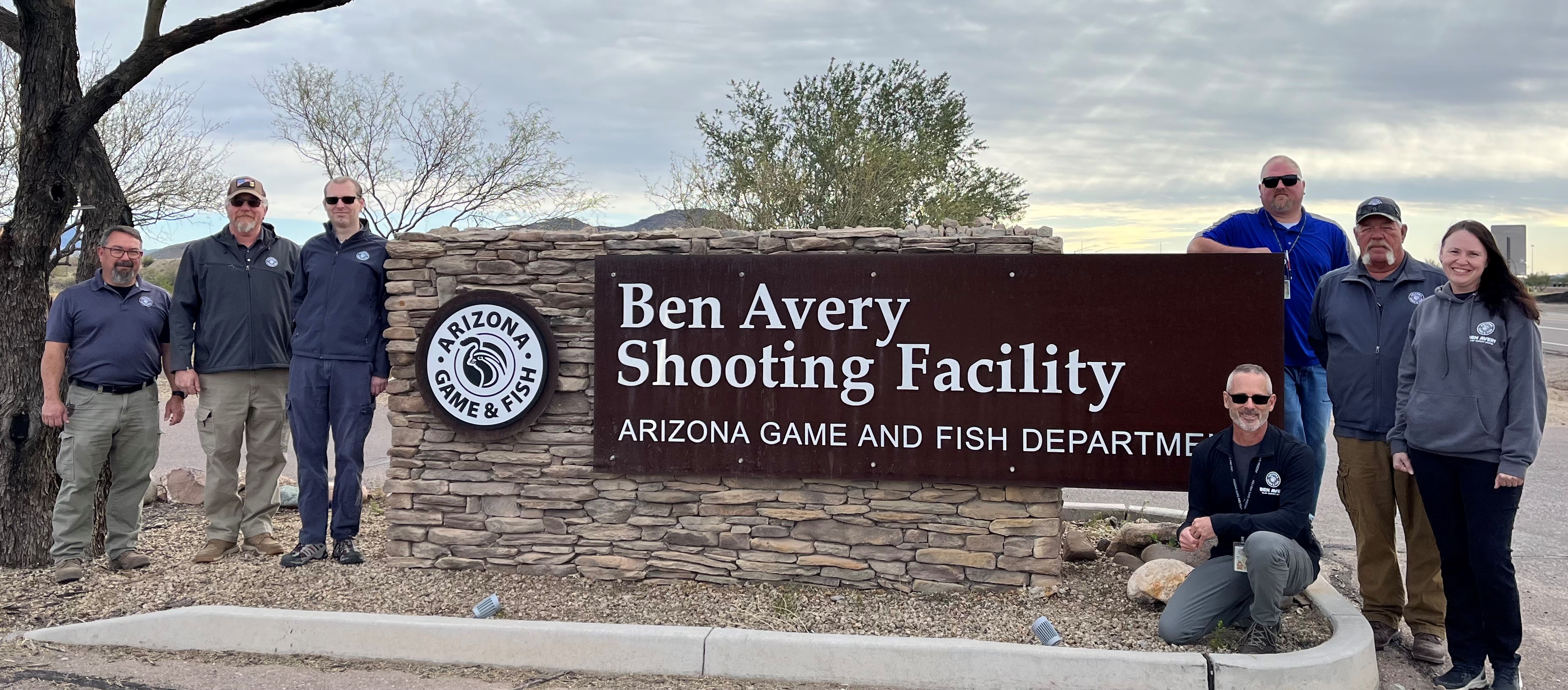Arizona Game and Fish staff stand by the Ben Avery Shooting Facility sign.