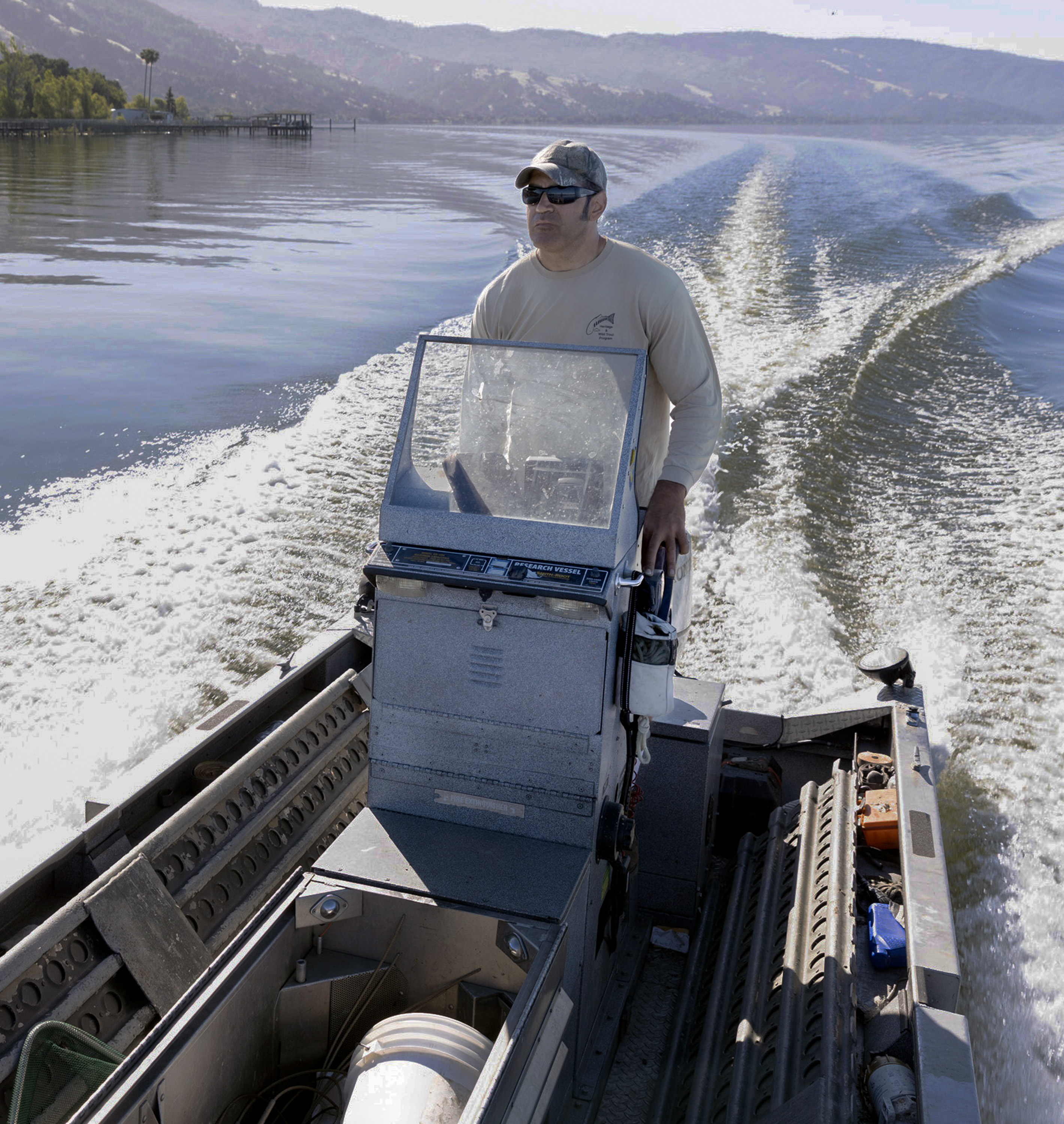 Ben Ewing, California Department of Fish and Wildlife biologist on Clear Lake doing surveys for hitch in June 2024. Credit: John Heil/USFWS