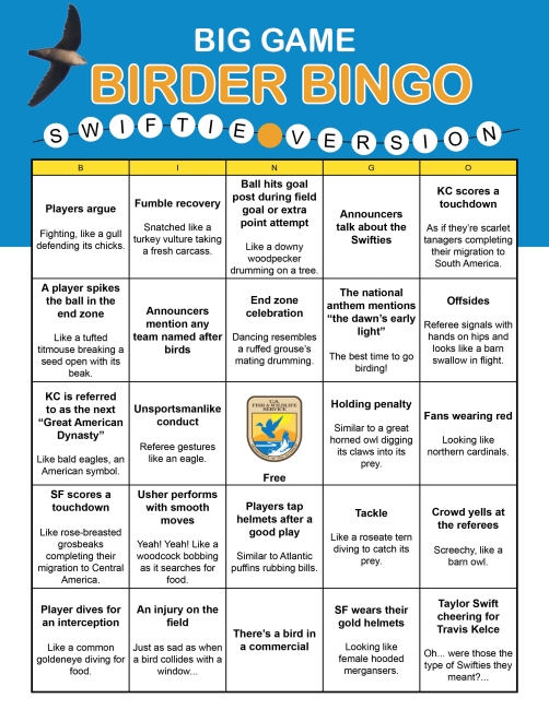 Birder bingo for Swifties to play along during the biggest football game of the year.