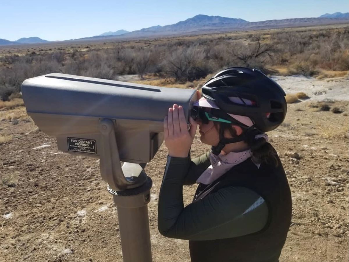 A cyclist stops at Ash Meadows to look at wildlife through on-site binoculars