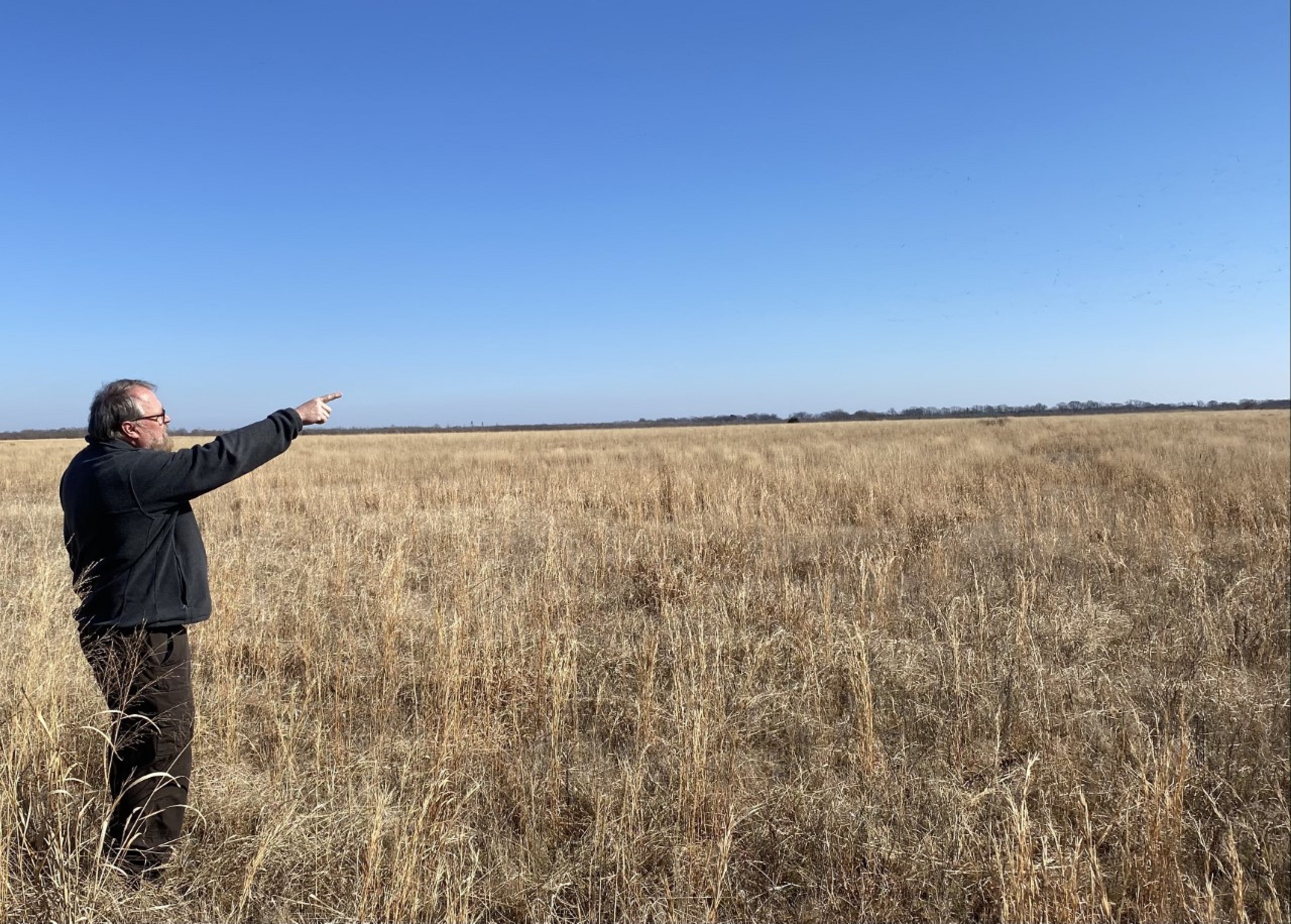 Richard Crossett points to a skein of snow geese crossing high above the Howell Tract.