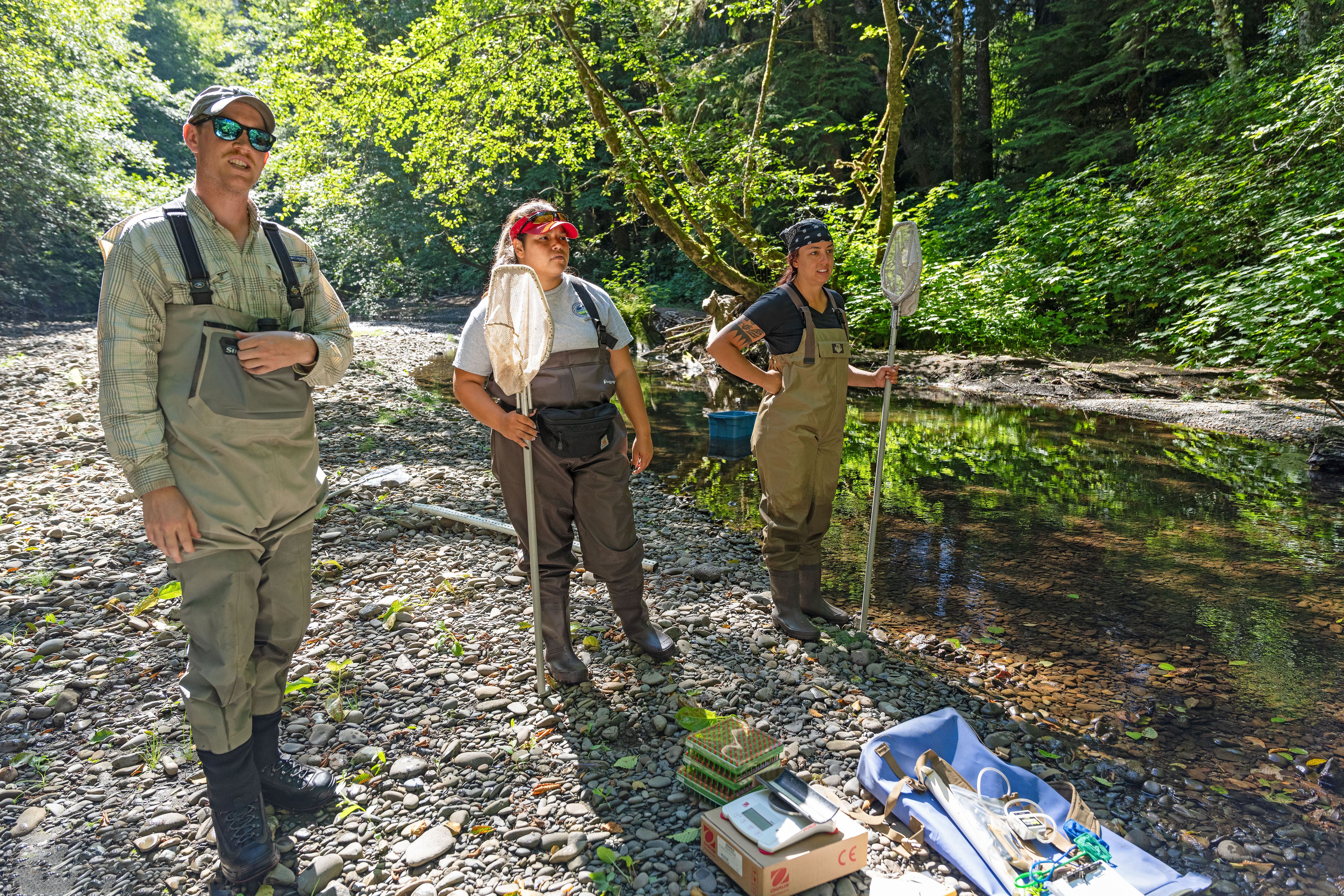 Biologist Gregory Byford and BIA Tribal WaterCorps Interns Elena Prest (middle) and Bethany Fackrell (right) surveying the Tsoo-Yess River prior to sampling for juvenile Coho Salmon.