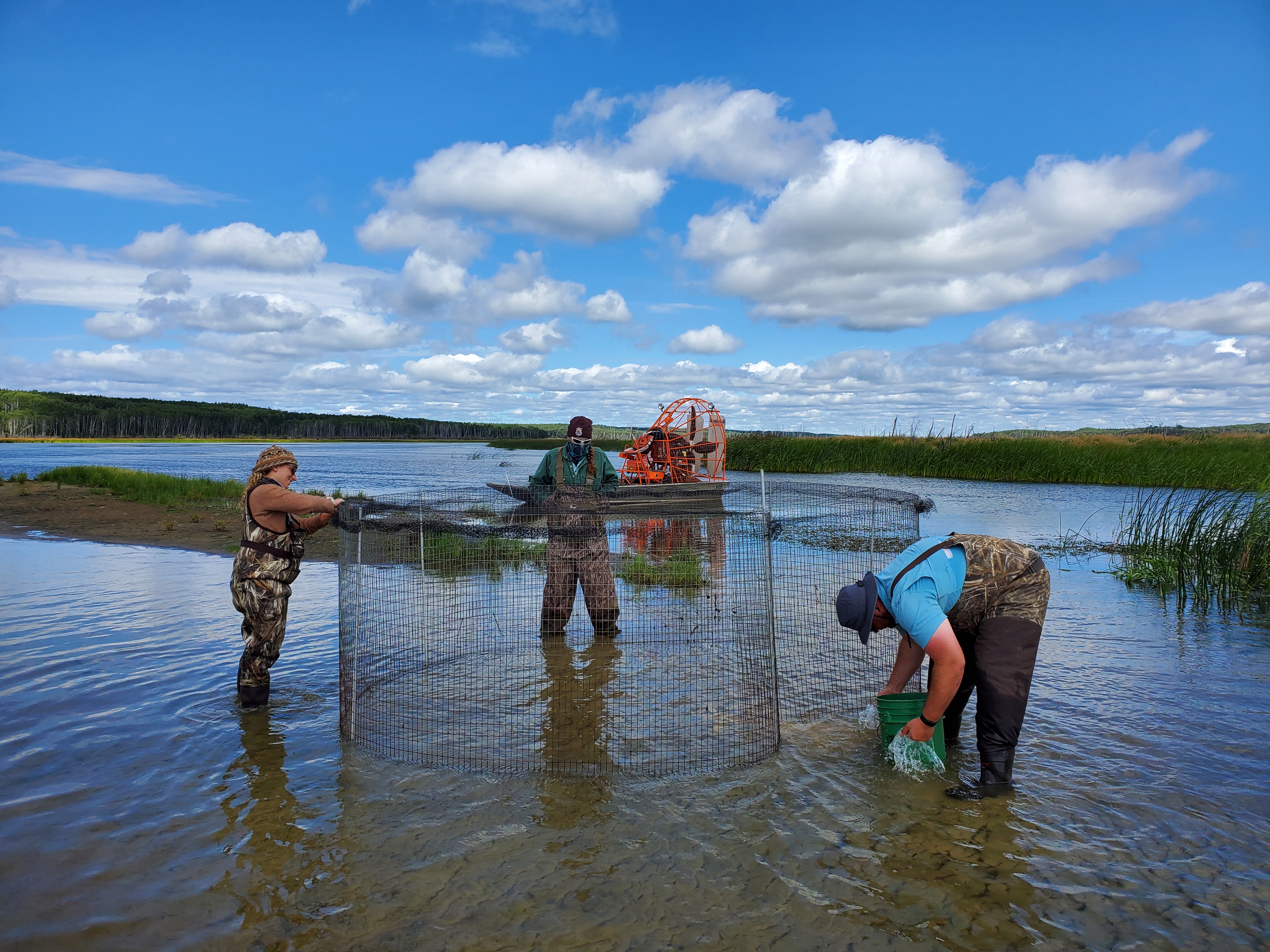 Biologists work to construct a swim-in traps to catch waterfowl as part of the 2022 Waterfowl Banding Operations, also known as the Western Canada Cooperative Banding Program.