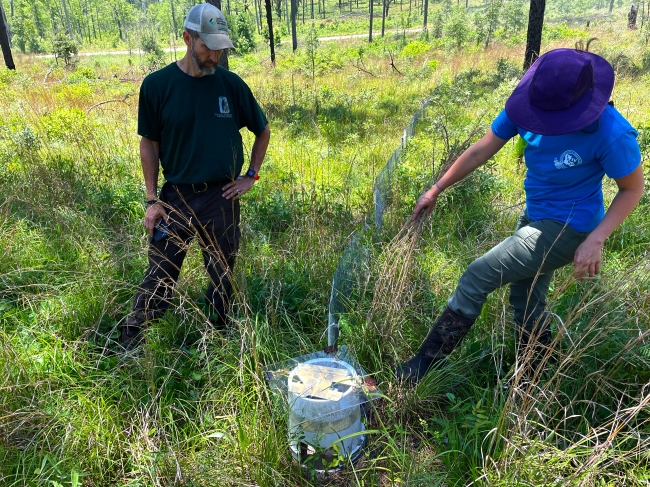 Field Biologists Chris Melder and Tara Preuett, Center for the Environmental Management of Military Lands, inspect a camera snake trap near Fort Polk, Louisiana, May 26, 2022. Camera snake traps are used to photograph snakes for important data collection purposes, especially for the threatened Louisiana pine snake. The U.S. Fish and Wildlife Service works closely with its partners in the Department of Defense, U.S. Forest Service and CEMML to protect threatened and endangered plants and animals that occur on military lands.