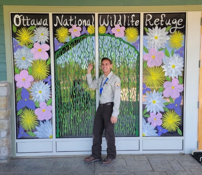 Logan created a mural at the Ottawa National Wildlife Refuge Visitor Center to educate visitors about bird collisions and how to prevent them. Logan Sauer/USFWS