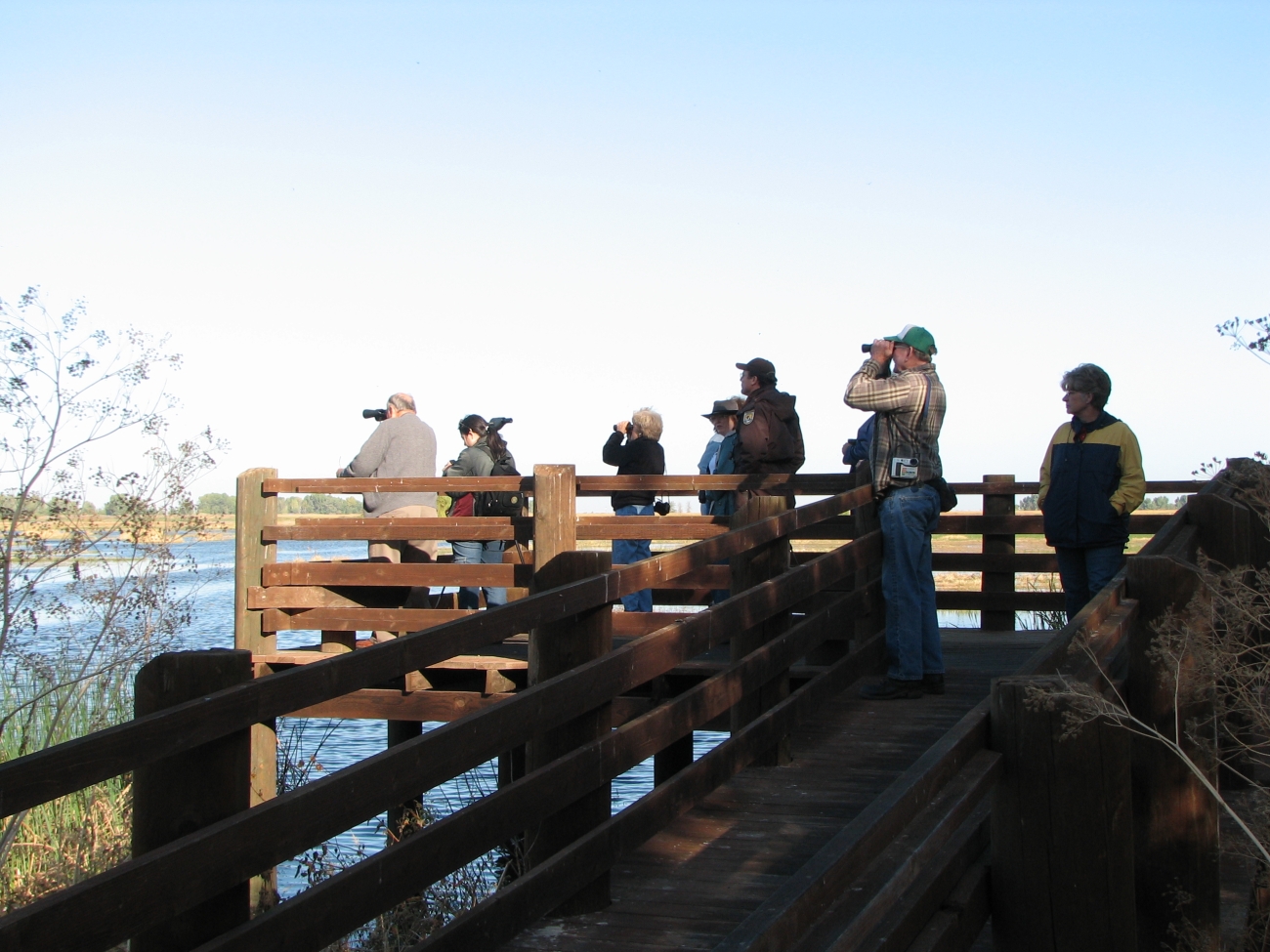 A birding group enjoying the sights and sounds of the Merced National Wildlife Refuge in California.