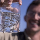 U.S. Fish and Wildlife Service biological technician Cole Moderegger with a jar containing black crappie fingerlings (Pomoxis nigromaculatus) about one month after they were hatched at Gavins Point National Fish Hatchery in Yankton, South Dakota.