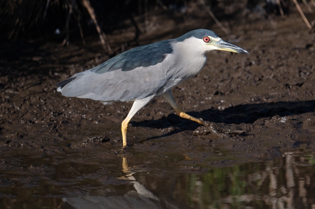 A black-crowned night heron walks in a mudflat at Hanalei National Wildlife Refuge.