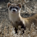 A ranch dog retrieves a black-footed ferret in 1981 near Meeteetse, Wyoming, renewing recovery efforts for the species once believed to be extinct.