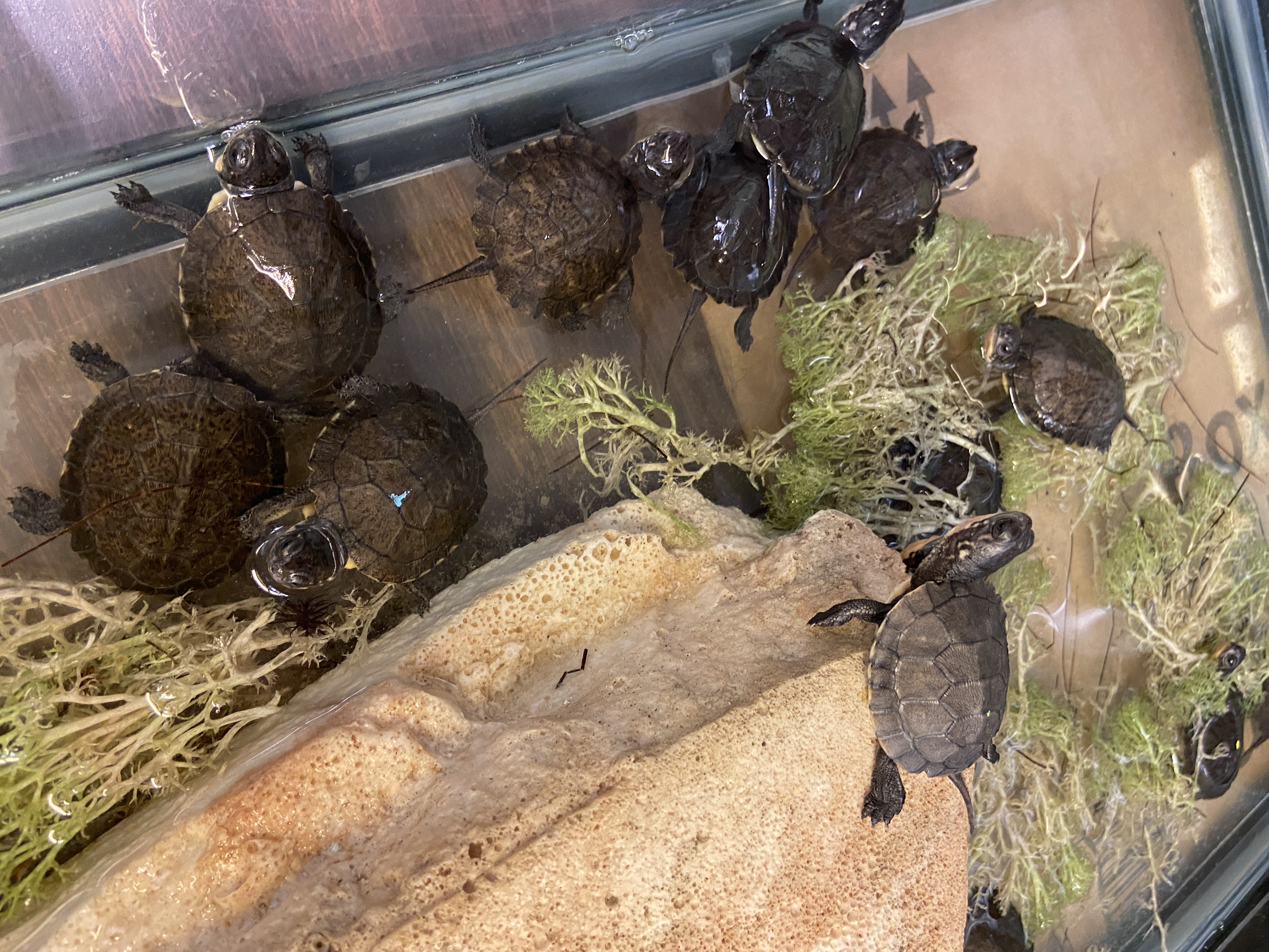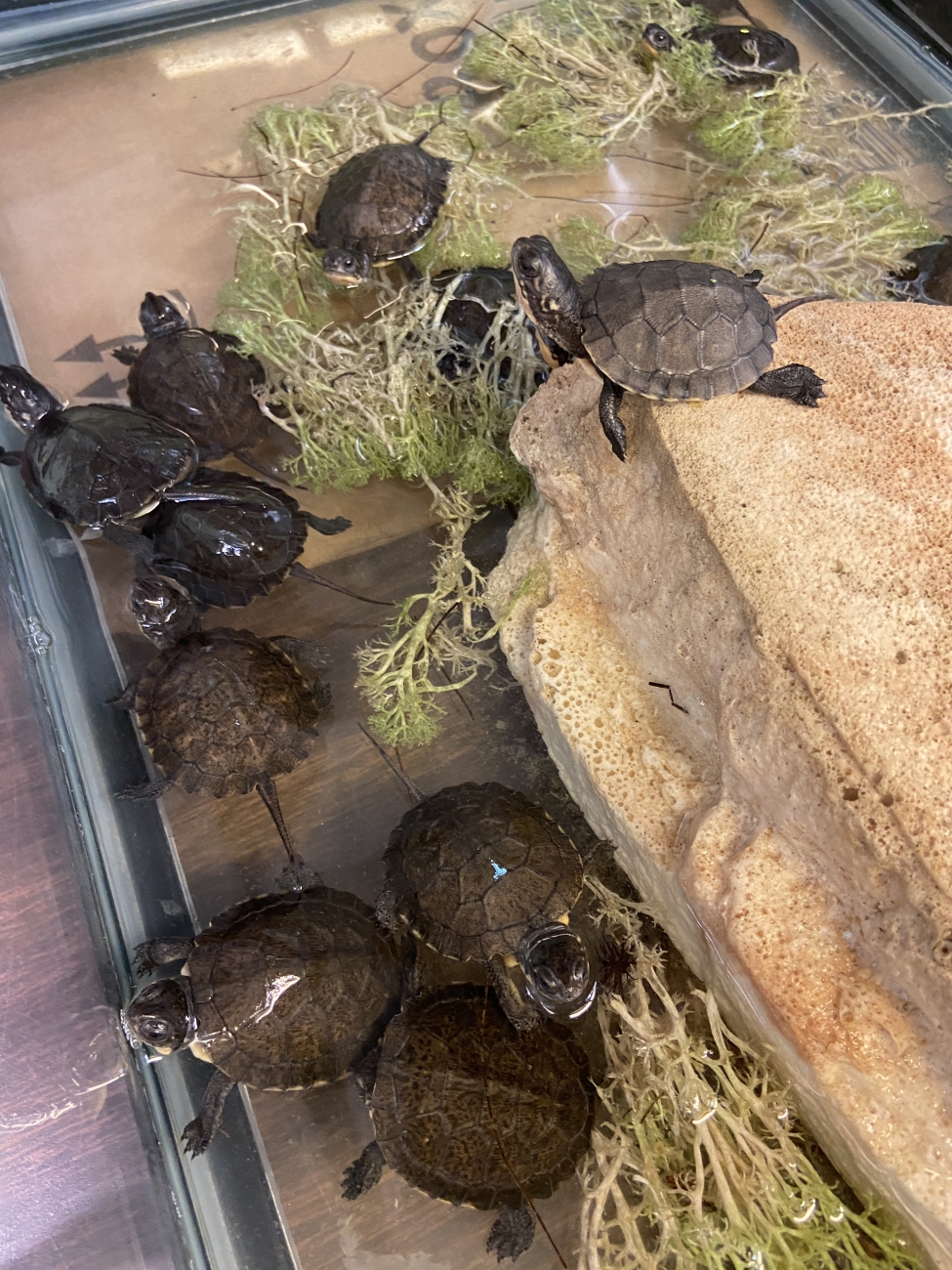 Blanding’s turtle hatchlings congregate in their warm tank awaiting the start of their “school” year, when they will be placed with local schools to be raised in captivity.