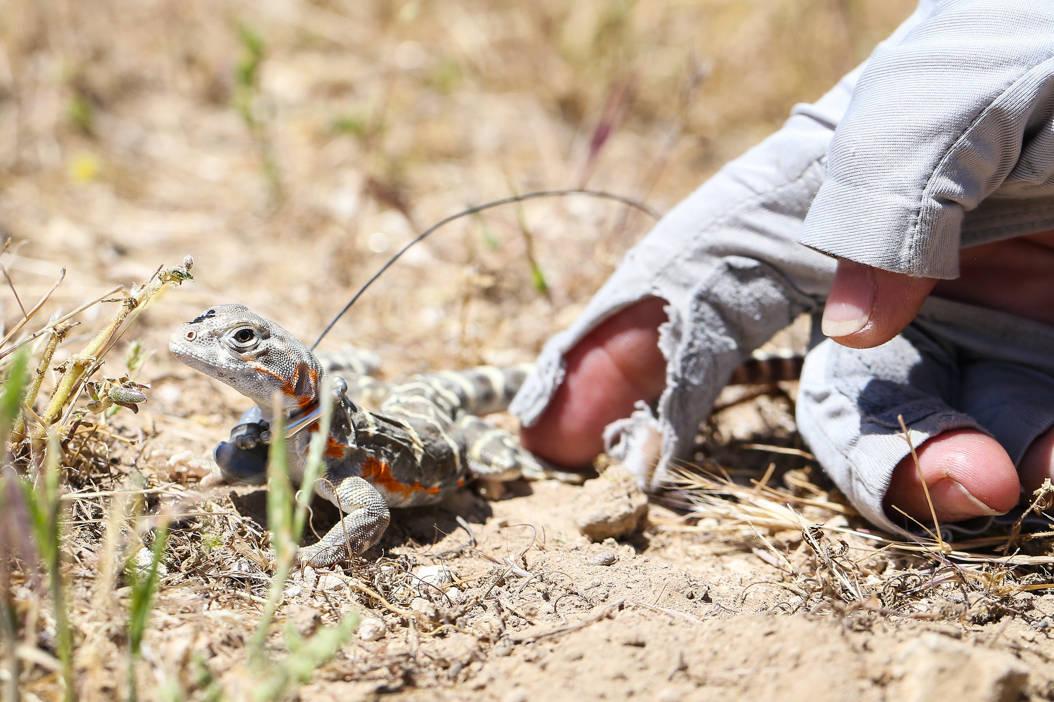 A biologist gently nudges a blunt-nosed leopard lizard to encourage it to explore its new home in the Panoche Hills Plateau, an area managed by the Bureau of Land Management. The 10 released lizards were raised in the Fresno Chaffee Zoo.