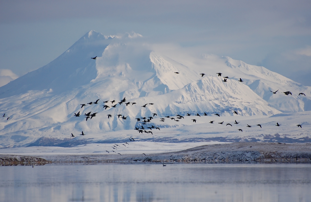 Black brant fly in front of Mount Dutton, Izembek National Wildlife Refuge.
