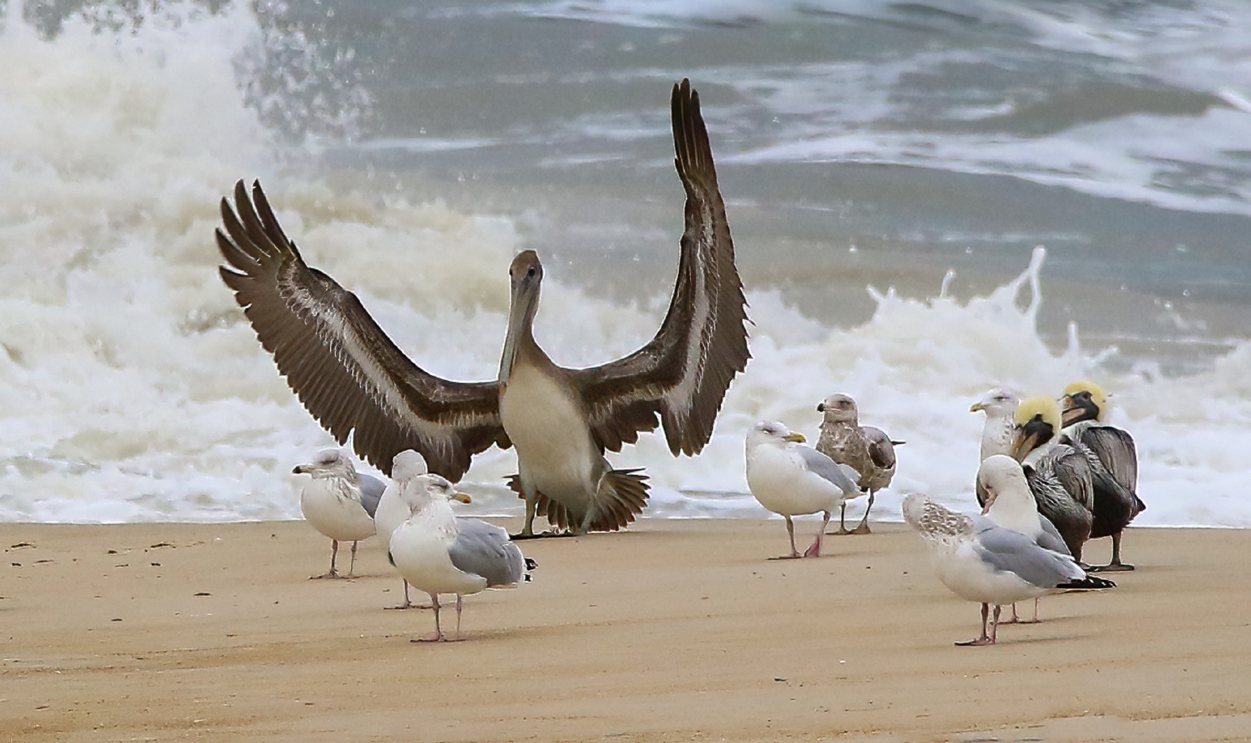 Brown pelican stands on sandy beach at oceans edge with it's wings widespread. Surrounded by other brown pelicans and herring gulls all standing on brown sand with the ocean crashing behind.