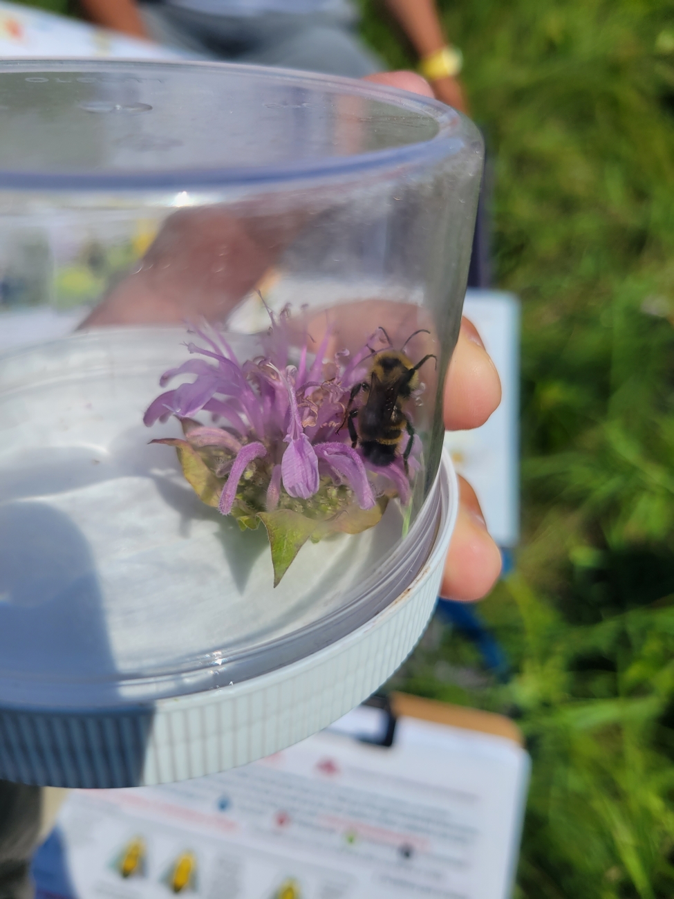 Following the Minnesota Bumble Bee Atlas protocol, our team captures bumble bees along with the plants they are foraging on in plastic jars so that they can be photographed and identified. The bumble bees are released at the end, so no bees are harmed.