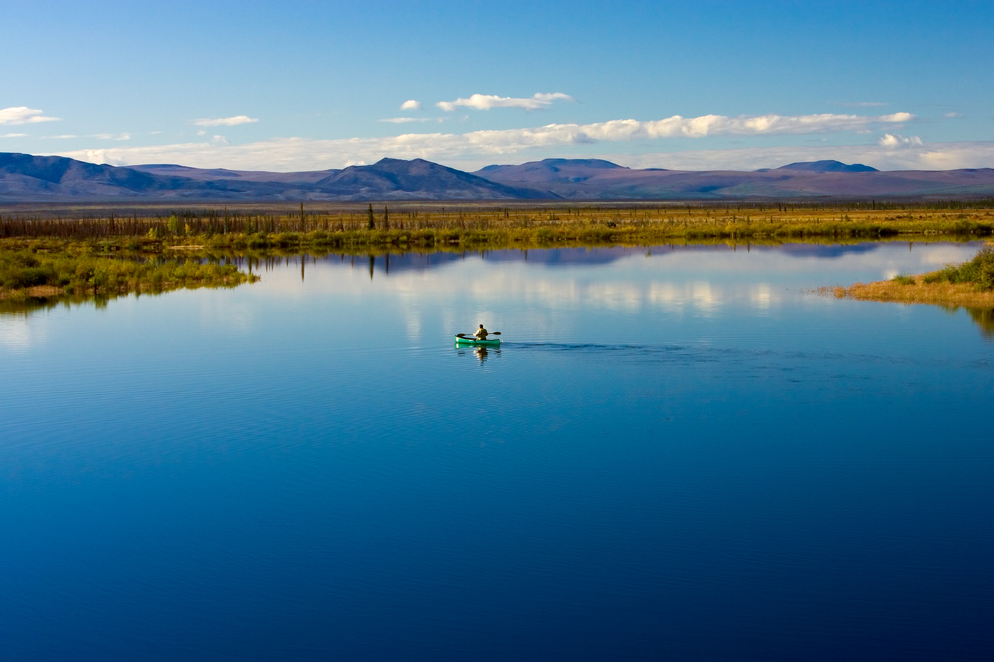 A canoe crosses a lake in Kanuti National Wildlife Refuge in Alaska.