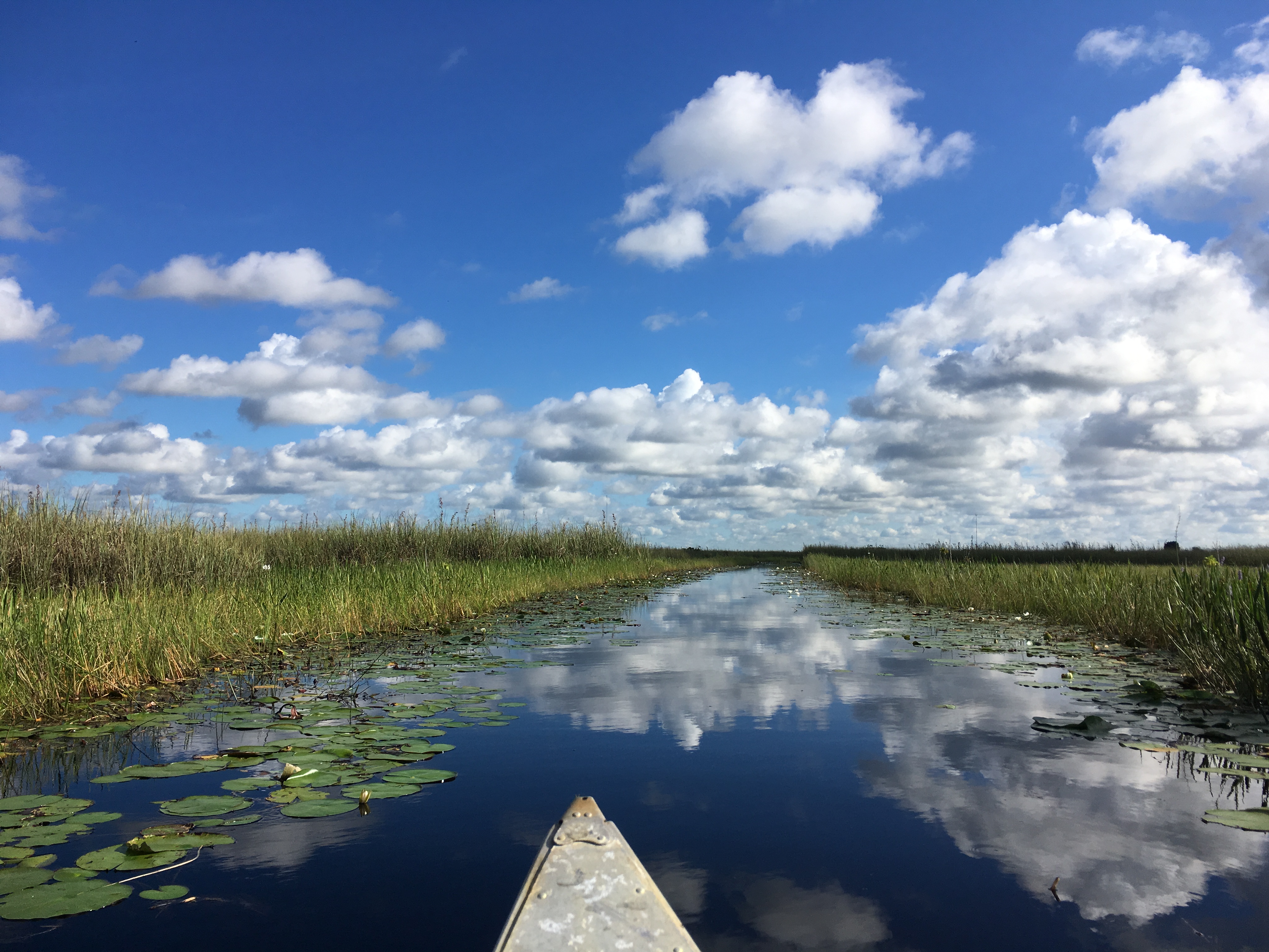 The bow of a canoe glides across calm waters with blue skies and puffy white clouds reflecting off the canoe trail at Arthur R. Marshall Loxahatchee National Wildlife Refuge.
