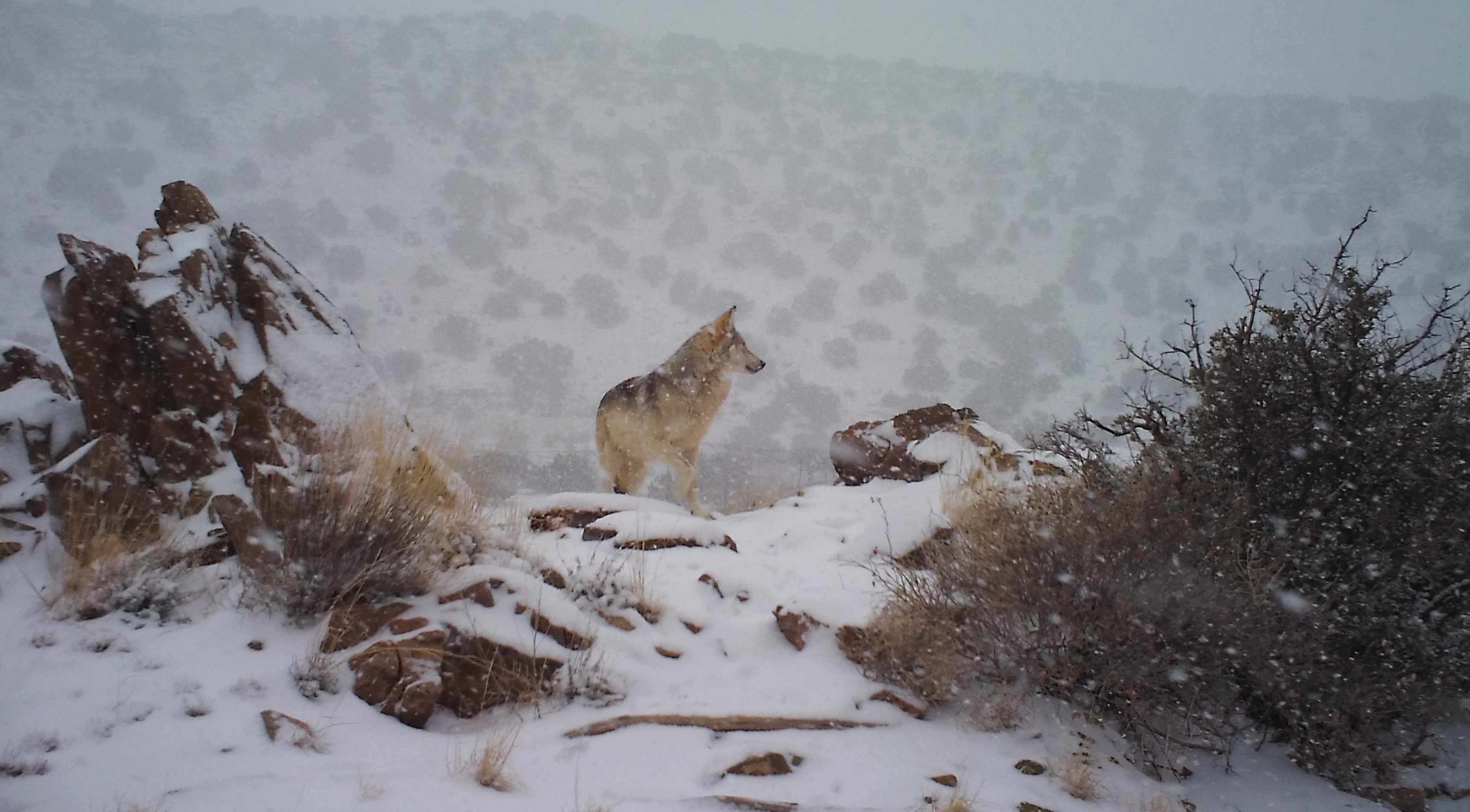 A Mexican wolf stands in the snow at the Sevilleta Wolf Management Facility.