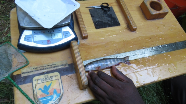 A Service fish biologist measures and documents a brook trout captured in Washington's Tyee Springs, which is the main water source for Carson National Fish Hatchery. Scientists with the Pacific Region's Columbia River Fish and Wildlife Conservation Office, Abernathy Fish Technology Center, and other partners are using YY brook trout males (which have two YY chromosomes) as a biological control strategy to eradicate the invasive brook trout from Tyee Springs since they pose a threat to the hatchery's spring Chinook.