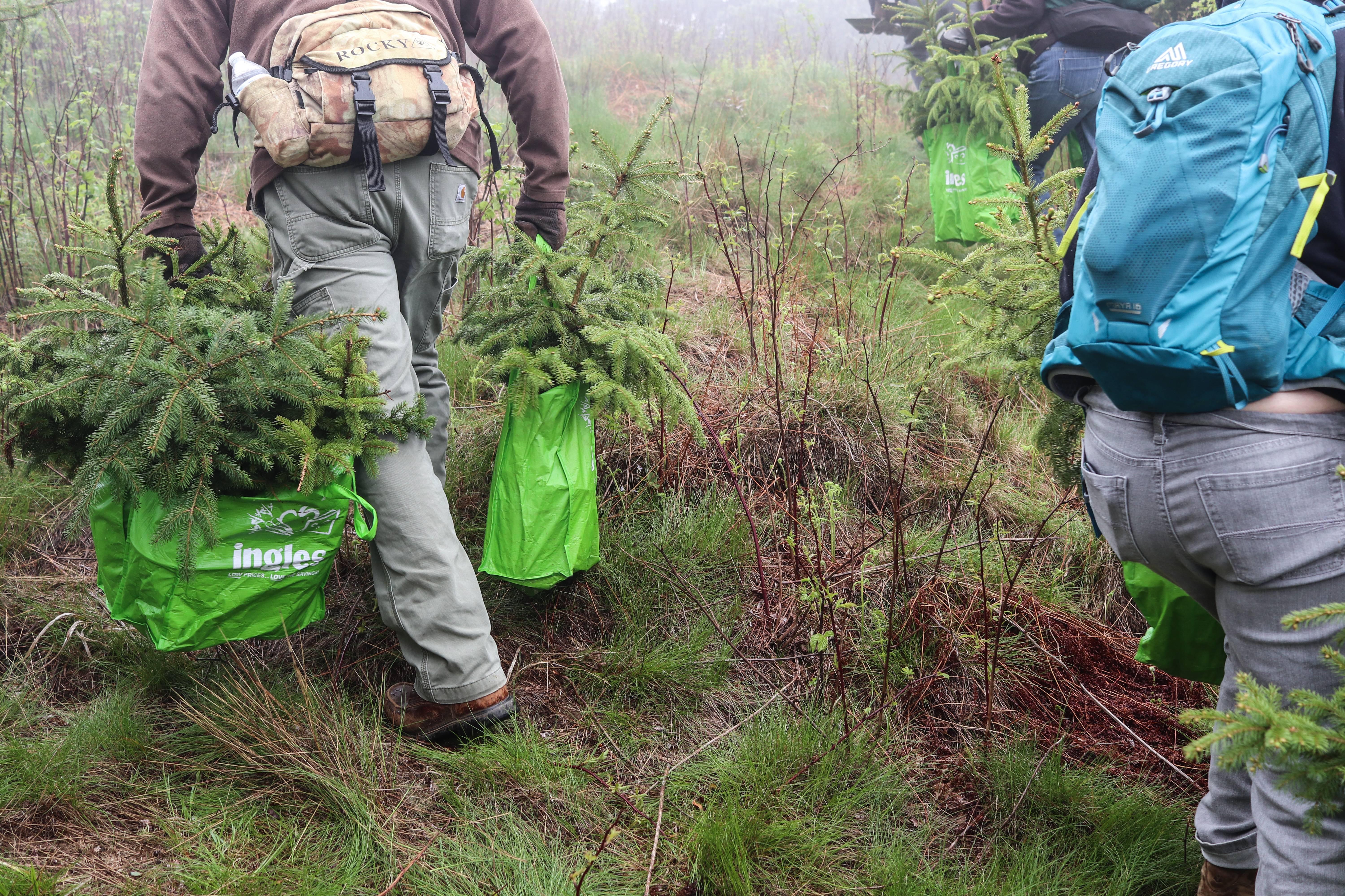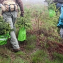 Volunteers carry red spruce trees to the spots where they'll be planted in Mount Mitchell State Park, North Carolina.