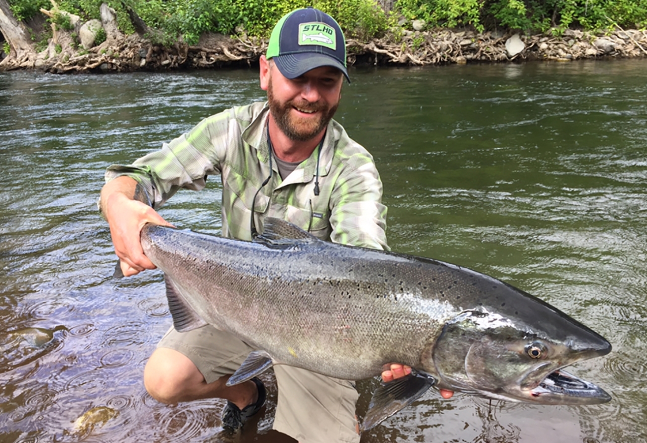 Brandon Pasley shows off a gorgeous summer Chinook salmon freshly caught near Entiat National Fish Hatchery.