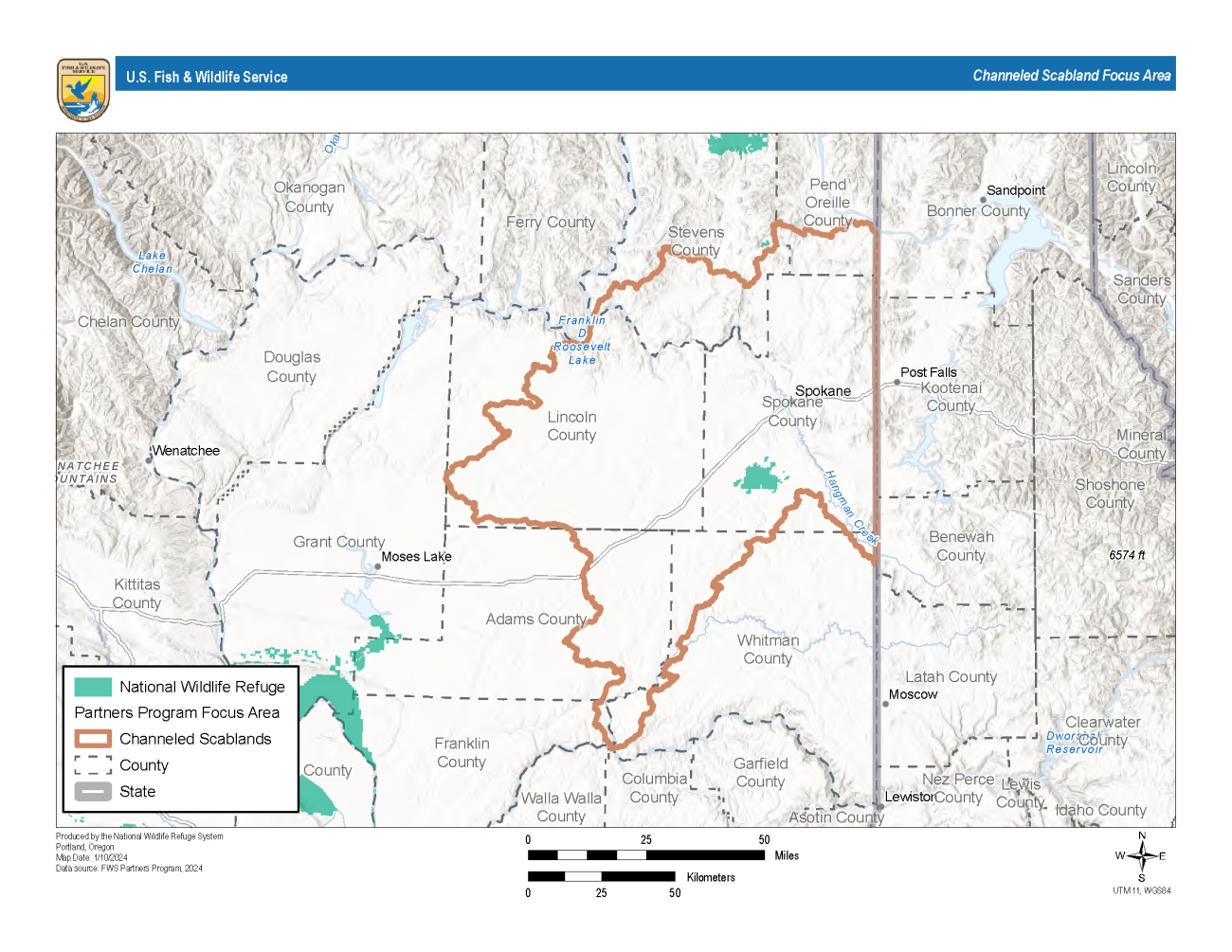 Map of the Partners for Fish and Wildlife Channeled Scablands Focus Area in eastern Washington