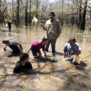 Children hunt for aquatic invertebrates during the "Be the Biologist" Junior Ranger Program at Trinity River National Wildlife Refuge in Fall 2021.