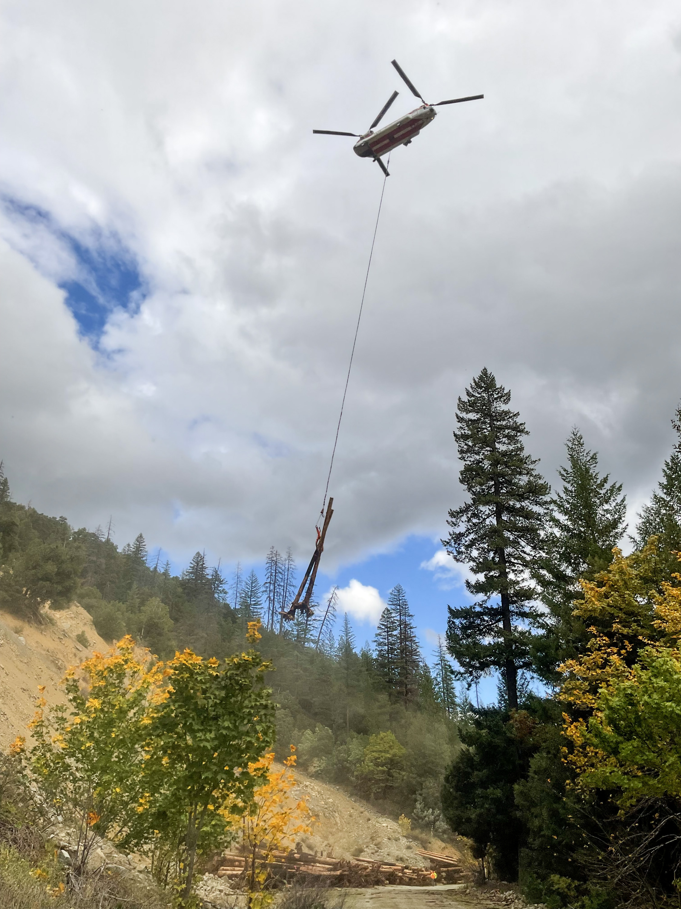 A chinook helicopter positions logs in West Fork Beaver Creek as part of the Bipartisan Infrastructure Law funded Beaver Creek Wood Loading Project. Photo courtesy of Mid Klamath Watershed Council